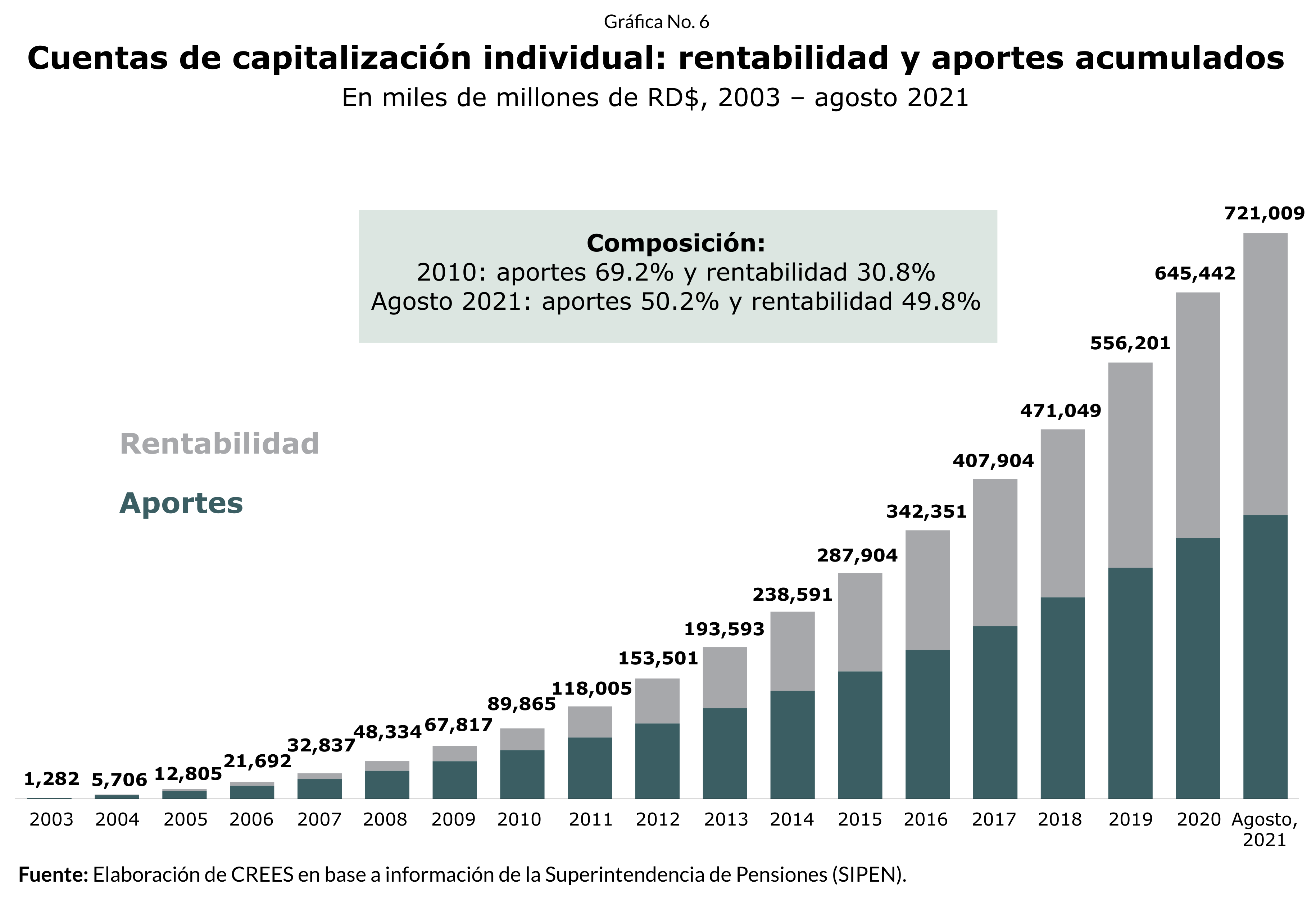 Un elemento importante que destacar es el patrimonio acumulado de las CCI, al igual que su composición. Al cierre de agosto de 2021, las cuentas de capitalización individual habían acumulado RD$721,009 millones. De este monto, los aportes realizados por los empleadores y trabajadores a las CCI representaron un 50.2%, lo que equivale a RD$361,801 millones. El 49.8% restante corresponde a la rentabilidad obtenida de esos aportes, en otras palabras, los RD$359,207 millones restantes provienen de las inversiones realizadas por las AFP.