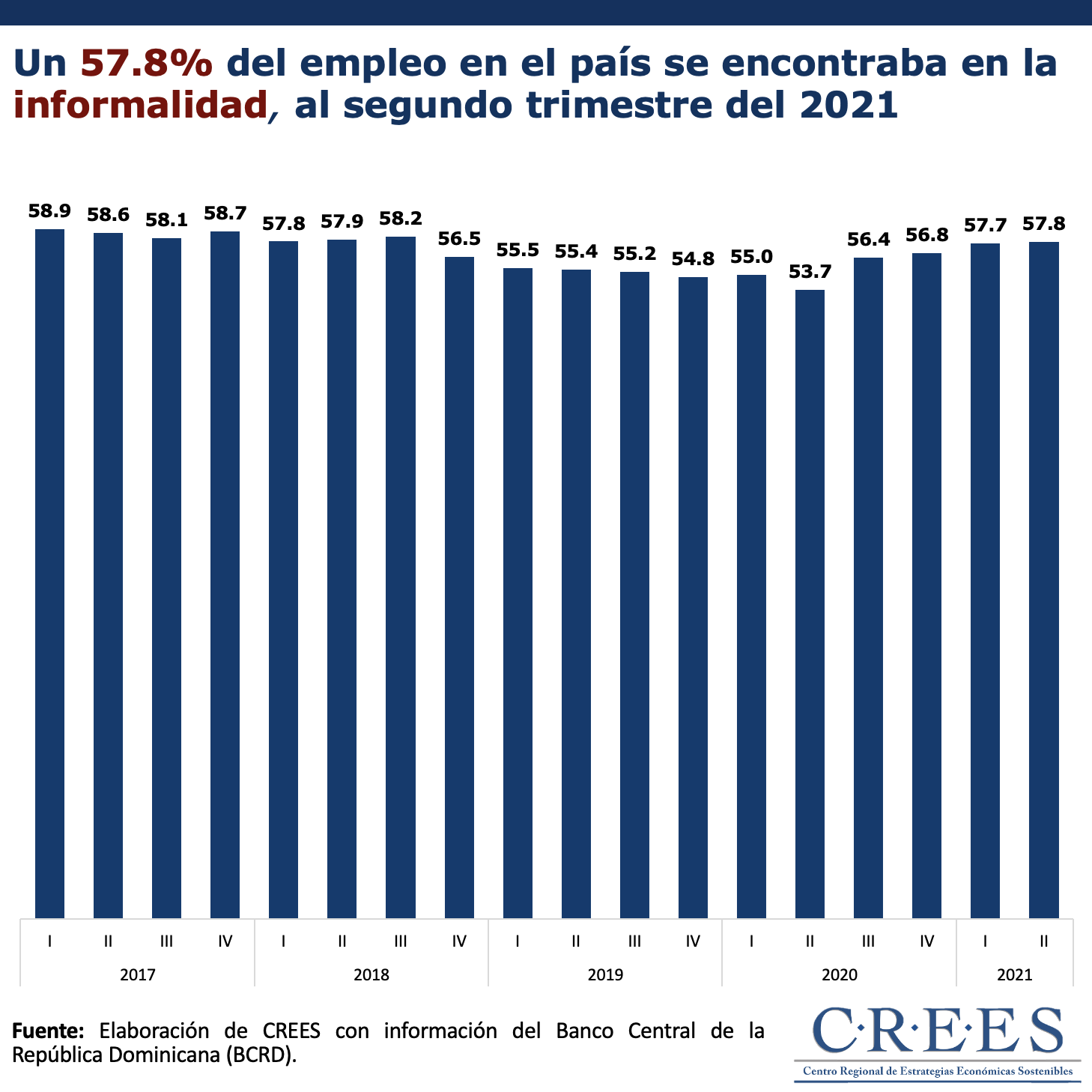 La informalidad en la economía dominicana es un fenómeno estructural relacionado con los altos costos vinculados al sistema tributario y a la legislación laboral del país. En los últimos cuatro años, las estadísticas del mercado laboral muestran que un promedio de 56.7% del empleo que se mantienen en la informalidad. En adición a esto, las distorsiones en el mercado laboral que ha provocado la pandemia de COVID-19 también han incidido en el aumento de la informalidad en los últimos trimestres.