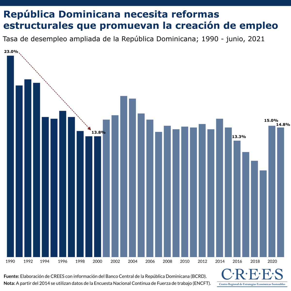 Estas reformas incentivaron un nuevo flujo de inversiones, de capitales provenientes del exterior y de origen local que tuvieron un efecto positivo sobre la creación de empleos; en consecuencia, reducción de la tasa de desempleo. Como se puede observar en la gráfica, la tasa bajó de 23.0% en el año 1990, a 13.9% en el 2000. Desde entonces, la economía dominicana no logró alcanzar una tasa de crecimiento en el empleo similar hasta el 2016. Lo anterior se debe a las contrarreformas implementadas en este periodo (2000-2016); por ejemplo, las modificaciones sucesivas que se realizaron al sistema tributario desde el año 2000.