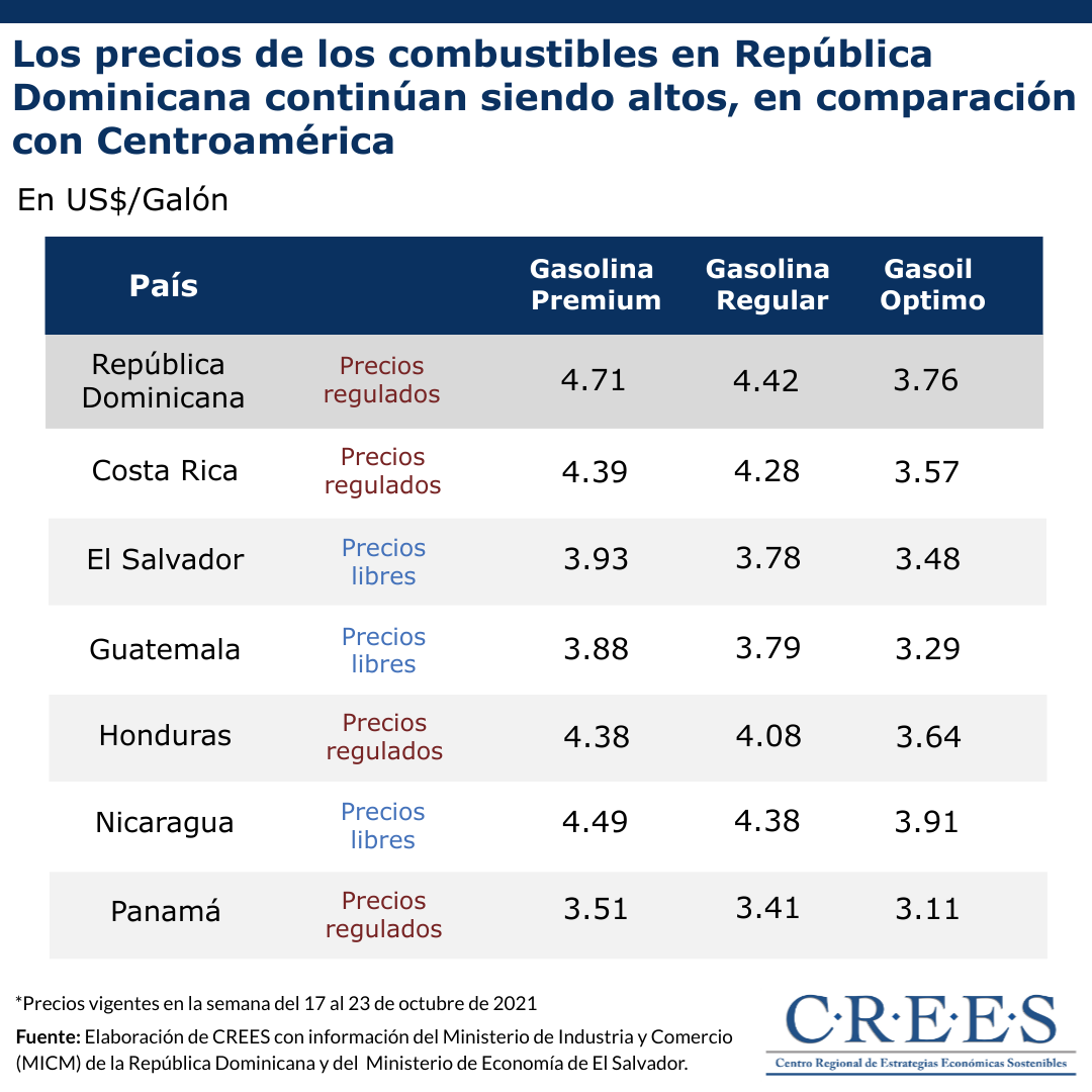 De acuerdo con la información de precios oficiales correspondientes a la semana del 17 al 23 de octubre de 2021, con excepción del gasoil optimo en Nicaragua, la República Dominicana es el país con los precios de los combustibles más altos en comparación con los países de Centroamérica.