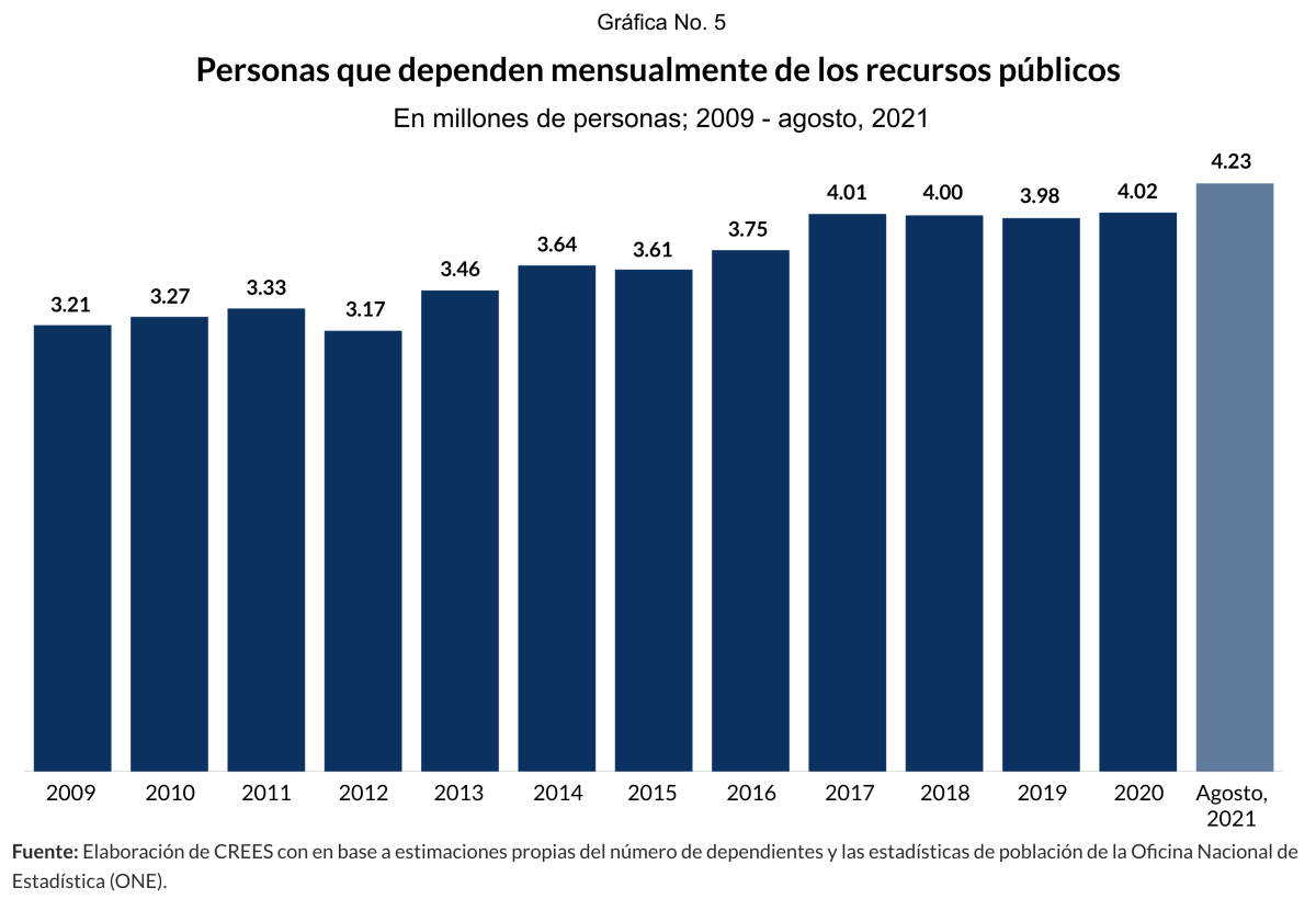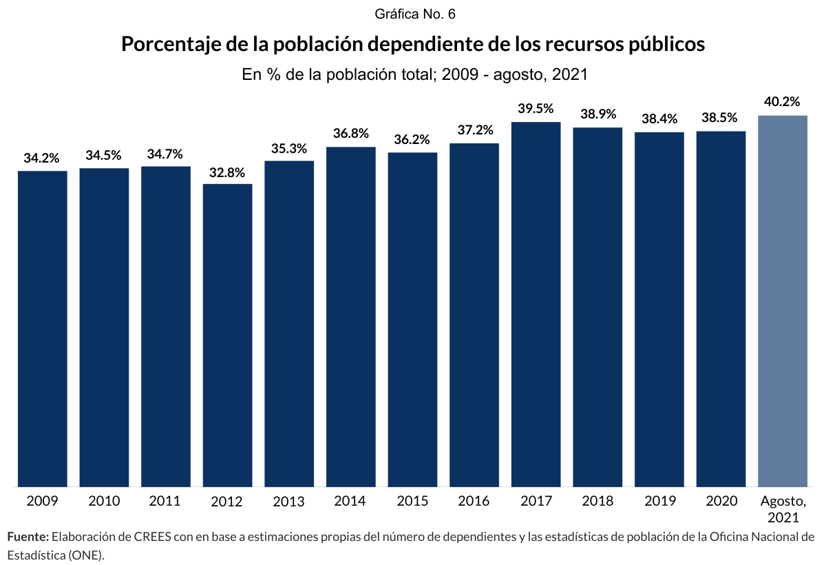 Aunque hay avances en ciertos aspectos, es alta la carga de dependientes de los aportes que hacen los mismos ciudadanos al fisco. Cerca de 40 de cada 100 dominicanos recibe mensualmente algún tipo de ingreso o transferencia de los fondos administrados por el gobierno. Esto es 4.2 millones de habitantes.