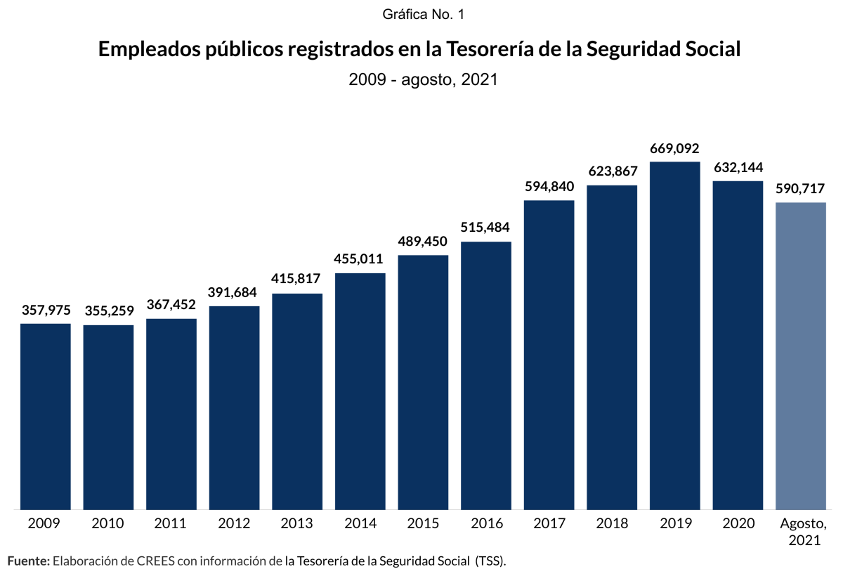 Es pertinente señalar algunos avances en las cifras de dependientes. El primero es que el número de empleados públicos registrados en la Tesorería de la Seguridad Social se redujo entre 2020 y agosto de 2021. Los datos del mes de agosto muestran 41,427 empleados menos que en diciembre de 2020. Comparado con el dato de 2018, el periodo de referencia de la primera medición que realizamos, el número de empleados públicos en la TSS pasó de 623,867 a 590,717 en la actualidad; una reducción menor, de 33,150 empleados públicos cotizando en la seguridad social.