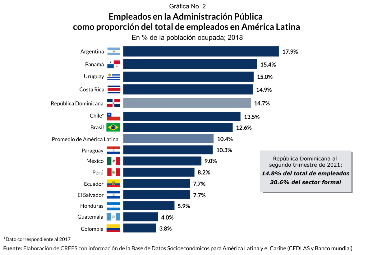 Otro punto para destacar con relación al empleo público es que los empleados en la Administración Pública de República Dominicana representan uno de los mayores porcentajes en América Latina. En el siguiente gráfico aparecen los datos con relación al total de empleos. Los países que le siguen a Argentina, primero en la gráfica, no guardan mucha diferencia entre unos y otros. República Dominicana en lugar de reducir la cantidad de personas que trabajan en la Administración Pública, ha experimentado un aumento como porcentaje del empleo total. Las cifras oficiales muestran, como se aprecia en el recuadro, que aproximadamente 15 de cada 100 dominicanos trabajan en la Administración Pública, y que, entre los empleados formales, la cifra representa 31 de cada 100. Esta es una forma de dimensionar el tamaño del Estado dominicano y, en consecuencia, el consumo de recursos que demanda.