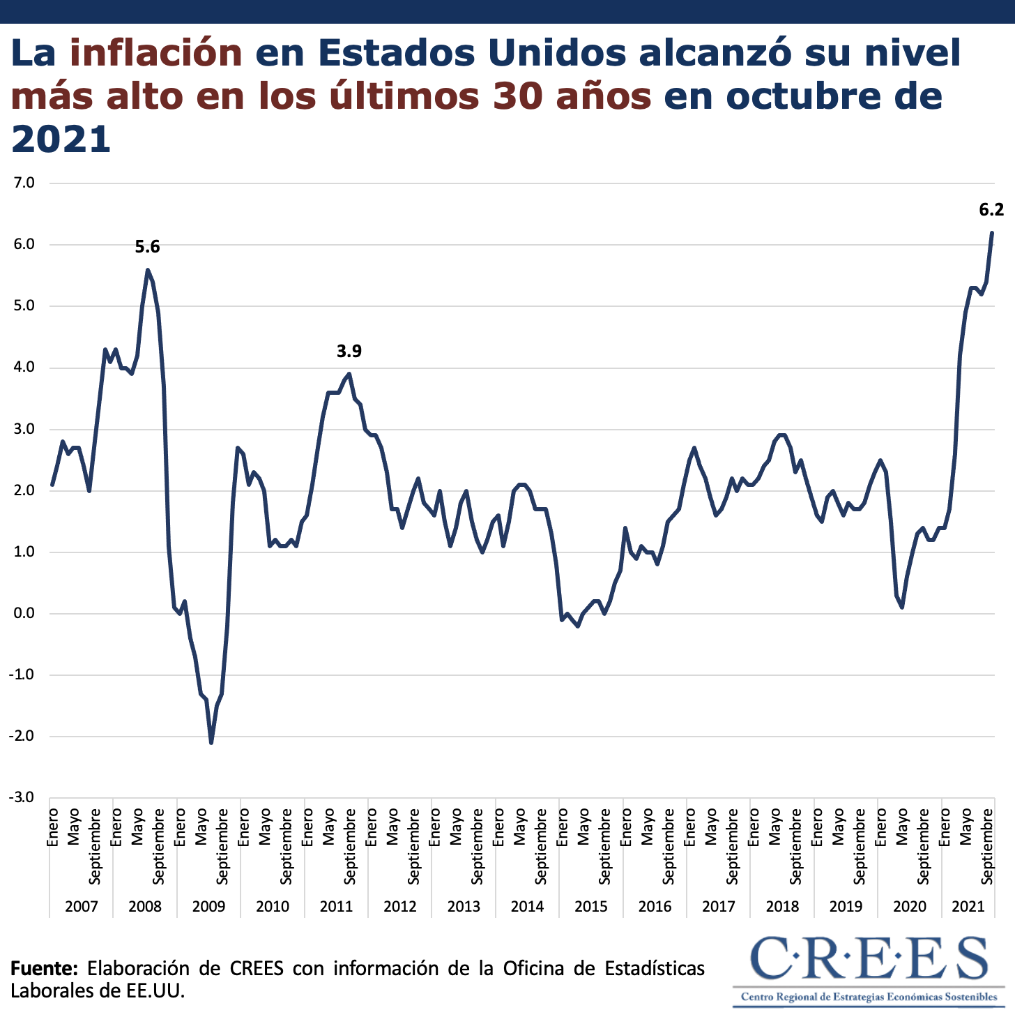 En octubre de 2021 la inflación interanual de Estados Unidos, es decir, la variación del Índice del Precios al Consumidor (IPC) con respecto a octubre de 2020, ascendió a 6.2%, el valor más alto en los últimos 30 años (desde diciembre de 1990). Mientras, la inflación acumulada del año (diciembre 2020-octubre 2021) se situó en 7.0%.