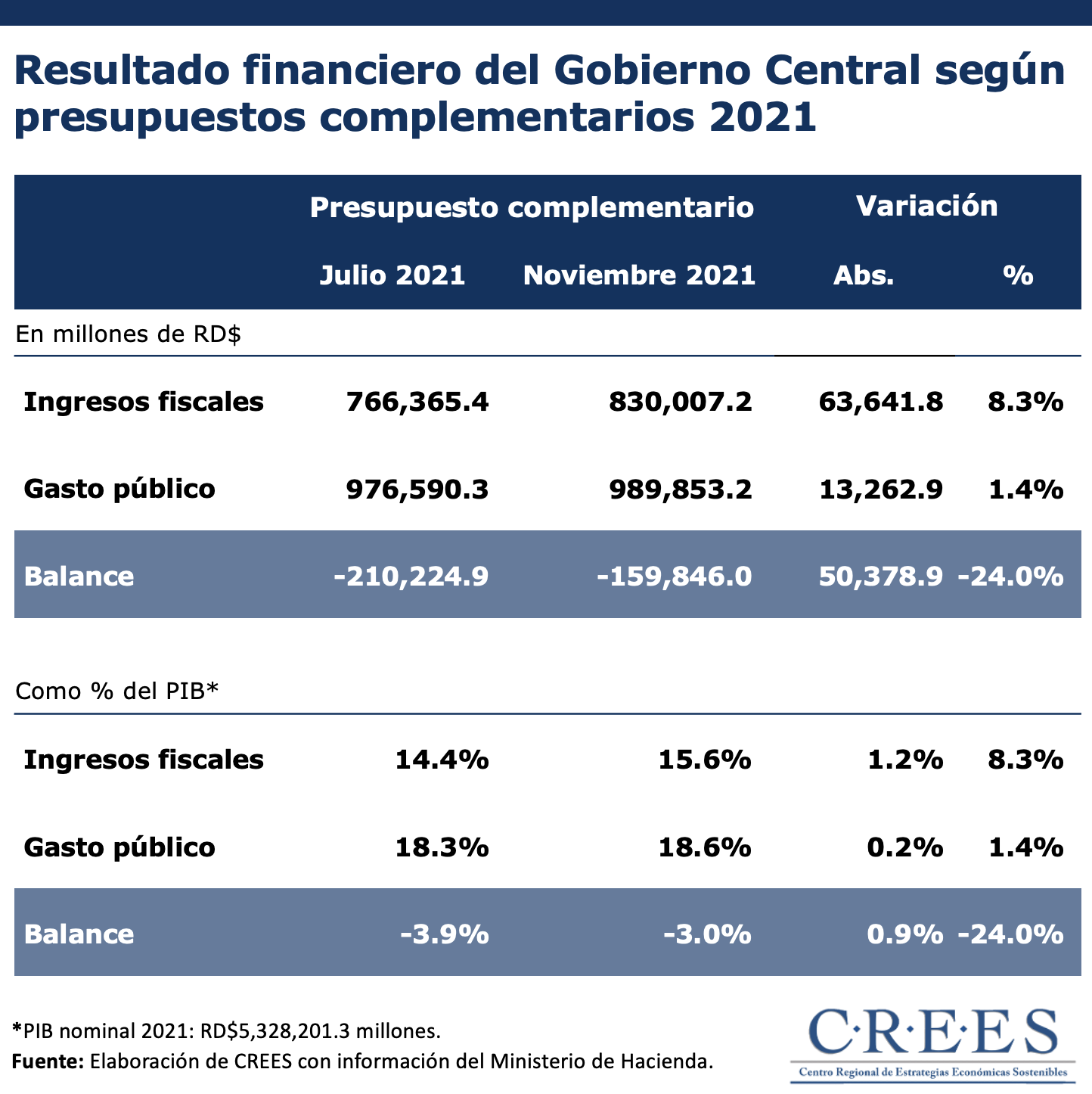 El pasado 15 de noviembre, el Poder Ejecutivo presentó al Congreso Nacional un segundo presupuesto complementario para 2021. De acuerdo con una nota del Ministerio de Hacienda, el déficit para el año 2021 se reduce en RD$50,379 millones con respecto al balance presentado en el presupuesto complementario de julio pasado. Sin embargo, las necesidades de financiamiento aumentan en RD$50,379 millones, lo que deja invariable el financiamiento para 2021. El nuevo balance fiscal para este año 2021 es el resultado de la diferencia de un incremento de RD$63,642 millones en los ingresos fiscales y de un aumento en el gasto de RD$13,263 millones.