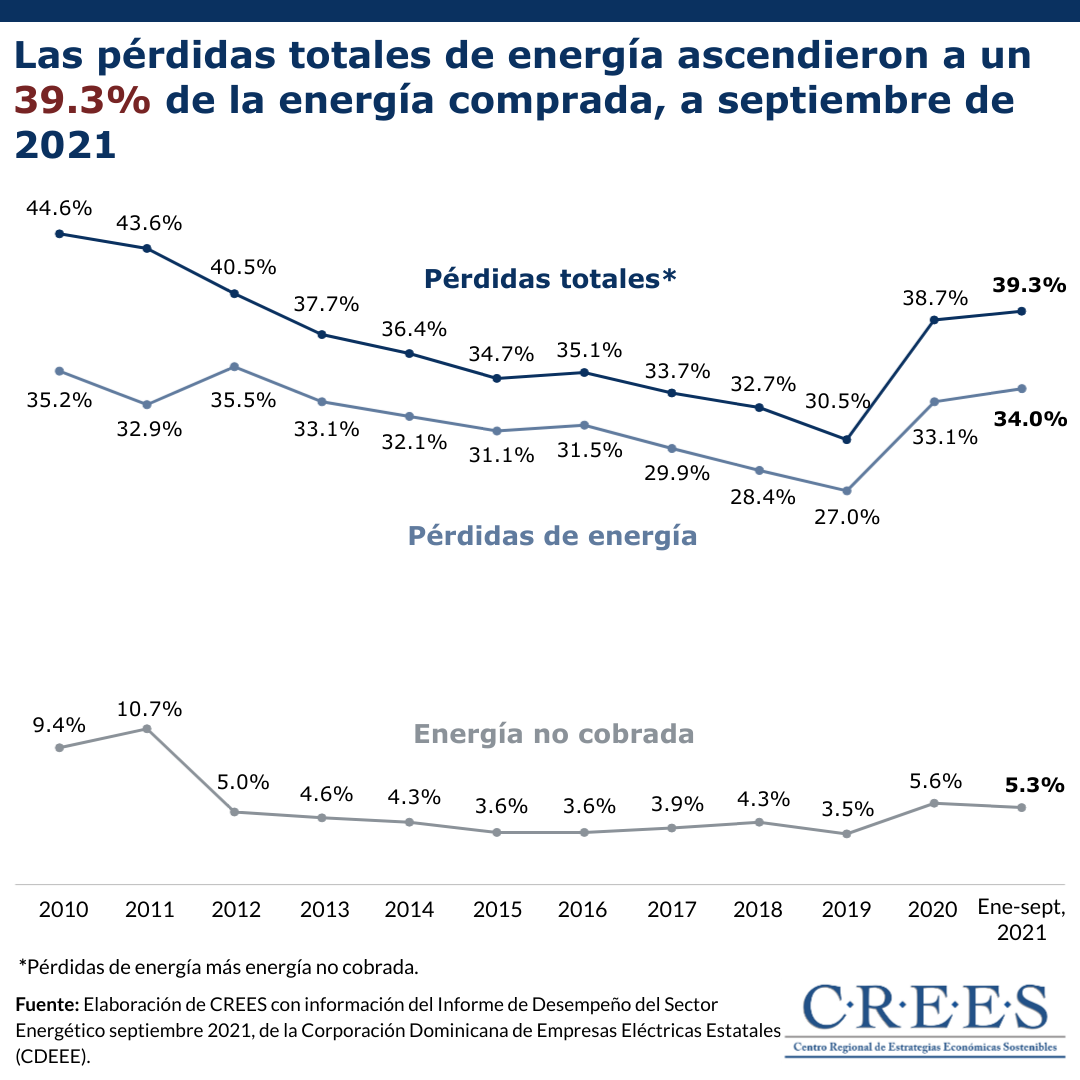 En el periodo enero-septiembre de 2021, las pérdidas de energía de empresas distribuidoras de electricidad (EDE) ascendieron a 4,197.9 GWh que, con relación a la compra de energía de este mismo periodo de 12,334.3 GWh, representan unas pérdidas de 34.0%. Esto, más el promedio de energía no cobrada en este periodo, que fue de 5.3%, significa que las pérdidas totales de energía eléctrica ascendieron a un 39.3% de la energía comprada.