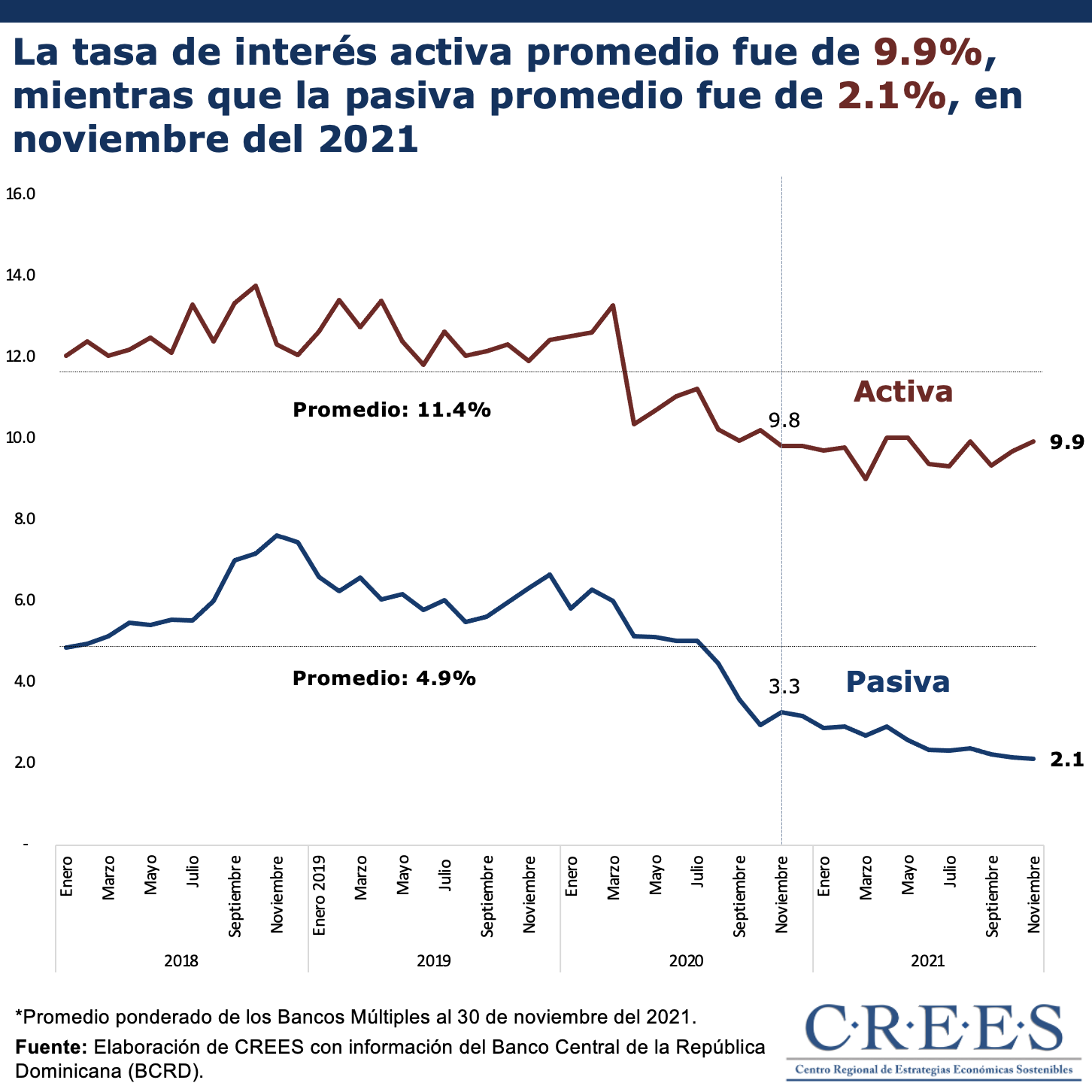 En noviembre del 2021, la tasa de interés activa promedio ponderada de los Bancos Múltiples fue de 9.9%, mientras que la tasa de interés pasiva promedio ponderada de los Bancos Múltiples fue de 2.1%, lo que equivale a un margen de intermediación de 7.8 puntos porcentuales. Se entiende como tasa de interés activa al porcentaje cobrado por las entidades financieras sobre el dinero que prestan y como tasa de interés pasiva al porcentaje que pagan los entidades financieras a los ahorrantes por mantener sus fondos en las cuentas del banco.
