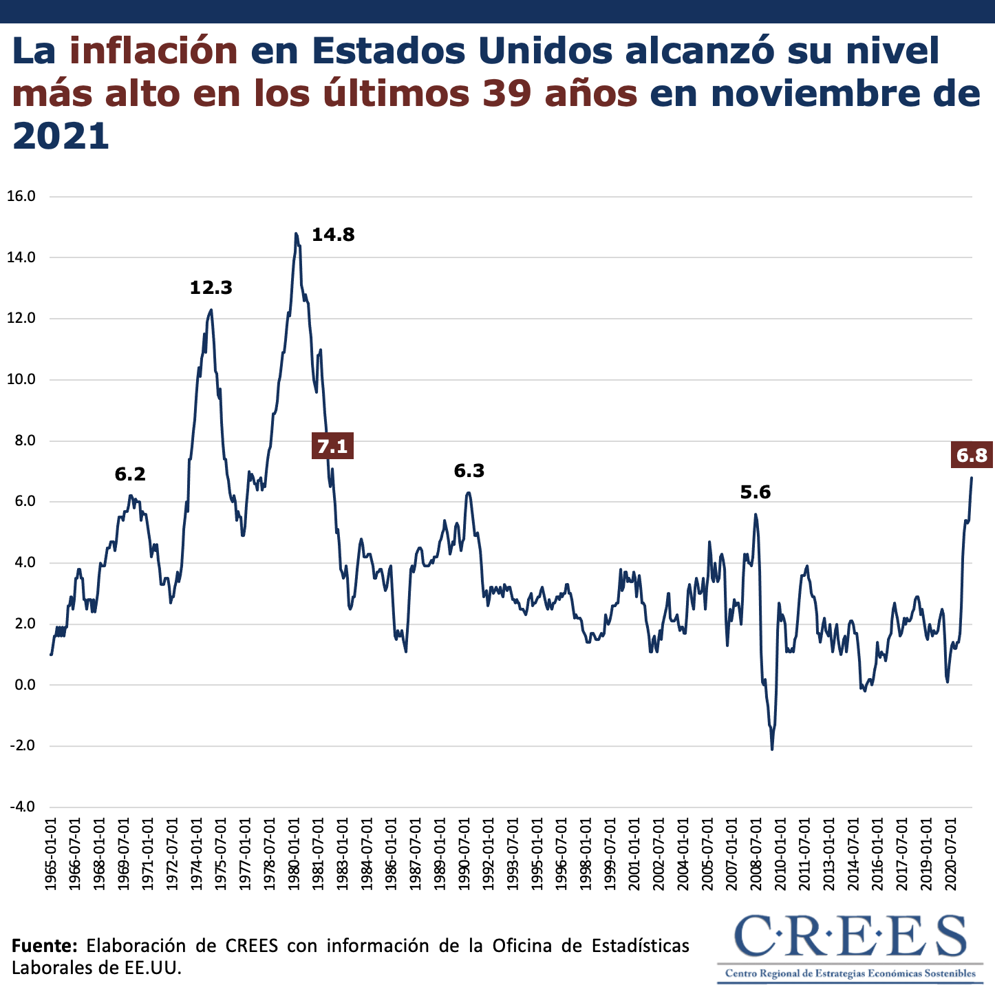 En noviembre de 2021 la inflación interanual de Estados Unidos, es decir, la variación del Índice del Precios al Consumidor (IPC) con respecto a noviembre de 2020, ascendió a 6.8%, el valor más alto en los últimos 39 años (desde junio de 1982). Mientras, la inflación acumulada del año (diciembre 2020-noviembre 2021) se situó en 6.7%.