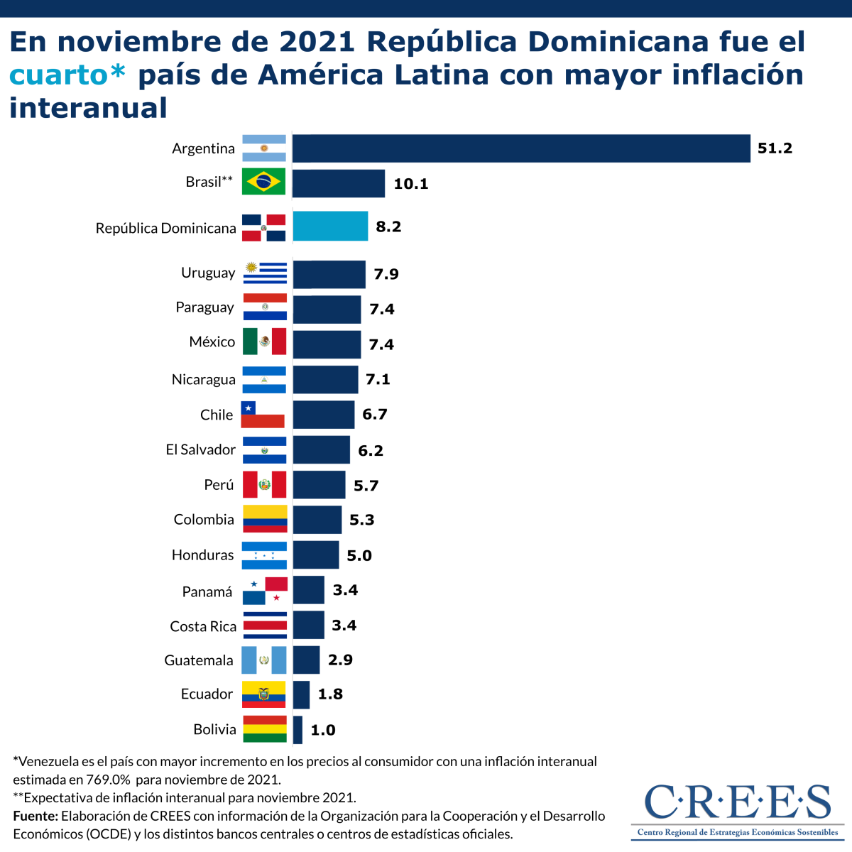 En noviembre de 2021, la inflación interanual, es decir, la variación del Índice del Precios al Consumidor (IPC) con respecto a noviembre de 2020 en República Dominicana fue de 8.2%, ubicándose como el cuarto país en la región con mayor incremento interanual en sus precios; superado solo por Brasil (10.1%), Argentina (51.2%) y, aunque no se incluye en la gráfica, Venezuela (769.0%). Bolivia y Ecuador fueron los país con menor incremento en sus precios, con un 1.0% y 1.8%, respectivamente.