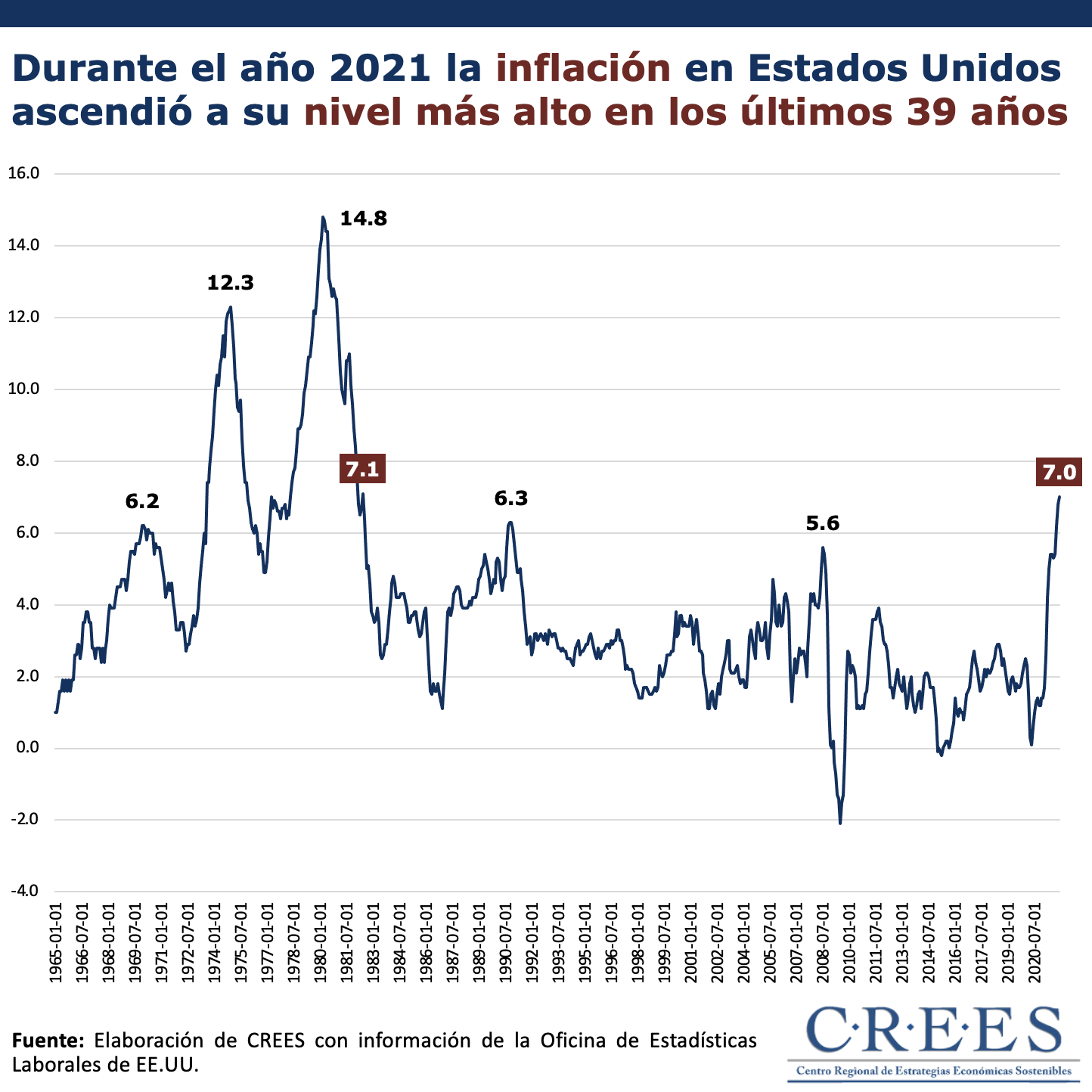 En diciembre de 2021 la inflación interanual de Estados Unidos, es decir, la variación del Índice del Precios al Consumidor (IPC) con respecto a diciembre de 2020, ascendió a 7.0%, el valor más alto en los últimos 39 años (desde junio de 1982). En este mes, los precios de los alimentos en Estados Unidos experimentaron un incremento interanual de 6.3%, mientras que los precios de la energía (combustibles y electricidad) se incrementaron en 29.3%, en promedio.