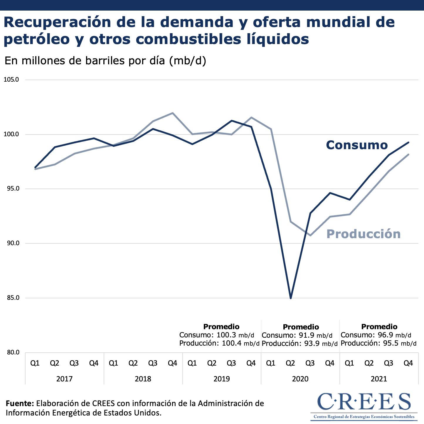 Según los datos de la Administración de Información Energética de Estados Unidos (EIA, por sus siglas en inglés) , en 2021 el consumo mundial de petróleo y otros combustibles líquidos promedió 96.9 millones de barriles por día (mb/d). Esto significa un incremento de 5.5%, equivalente a 5.0 mb/d, con respecto al consumo promedio de 2020 y una reducción de 3.4%, equivalente a 3.4 mb/d menos, con respecto a al 2019.