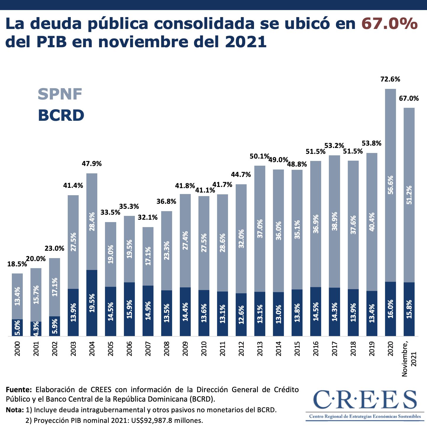 Es importante ver estos datos en términos absolutos en lugar de relativos; más aún considerando la contracción de 2020. A noviembre de 2021, la deuda pública consolidada ascendió a US$62,347.0 millones, de los cuales US$47,618.7 millones corresponden a la deuda del sector público no financiero (SPNF) y los US$14,728.3 millones restantes corresponden a la deuda del Banco Central de la República Dominicana (BCRD); unos RD$766,498.6 millones de la deuda del BCRD corresponden a los valores en circulación y los RD$86,147.9 millones restantes a los demás pasivos no monetarios del BCRD a noviembre de 2021.