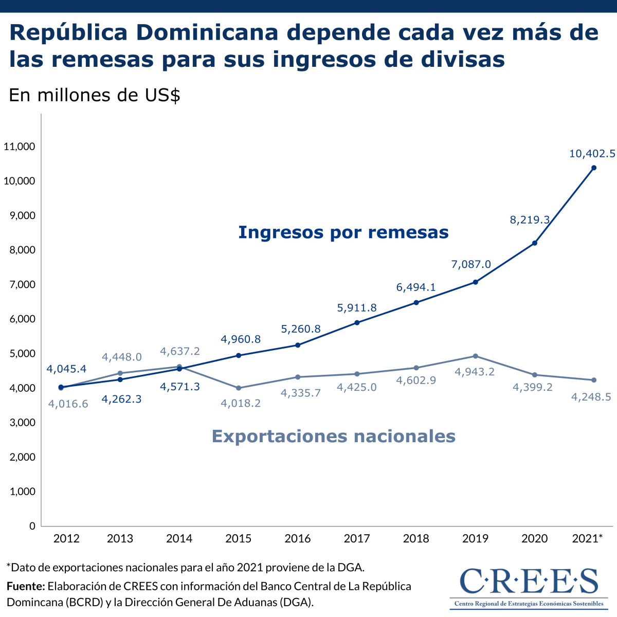 Una comparación entre la evolución de las exportaciones nacionales (incluyendo exportaciones nacionales no minerales) y los ingresos por remesas familiares nos muestra como la generación de divisas del país se vuelve cada vez más dependiente de la recepción de remesas de la diáspora dominicana en el mundo, y no de la comercialización con el mundo de bienes producidos localmente.