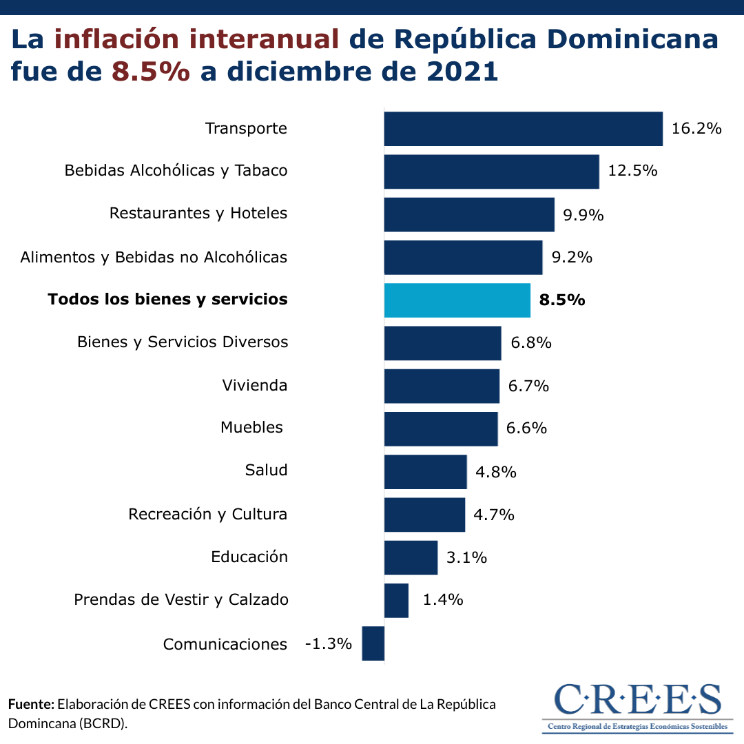 De acuerdo con los datos del Banco Central de la República Dominicana (BCRD), en diciembre del 2021 la inflación interanual, es decir, la variación del Índice del Precios al Consumidor (IPC) con respecto a diciembre del 2020, fue de 8.5%. Esto significa incremento de 2.9 puntos porcentuales con respecto a la inflación anualizada de precios de diciembre de 2020 (5.6%) y 4.8 puntos porcentuales con respecto a la de 2019.