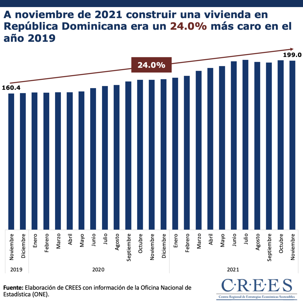 En noviembre de 2021, el Índice de Costos Directos de la Construcción de Viviendas (ICDV) fue de 199.0, en promedio, reflejando una incremento interanual de 12.7%. De igual forma, con respecto al mismo mes del año 2019 presentó un incremento de 24.0%. En otras palabras, actualmente construir una vivienda en República Dominicana es 24.0% más caro en el año 2019.