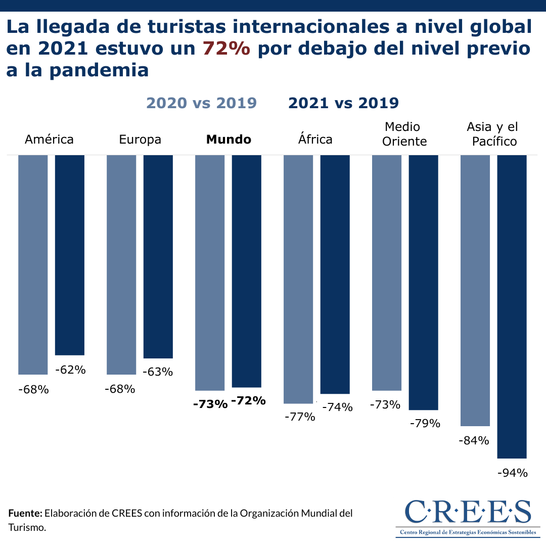 Cabe mencionar que, de acuerdo a las estimaciones de la Organización Mundial del Turismo, la contribución económica del turismo en 2021 fue de US$1.9 billones (trillones en inglés), superior a la US$1.6 billones estimados para 2020 pero aún muy por debajo del valor previo a la pandemia de US$3.5 billones.
