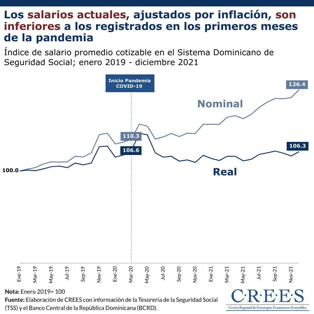 De acuerdo con los datos de salario promedio cotizable en el Sistema Dominicano de Seguridad Social (SDSS), los salarios actuales, ajustados por inflación, son inferiores a los registrados en los primeros meses de la pandemia de COVID-19; esto a pesar de importantes ajustes salariales realizados el pasado año.