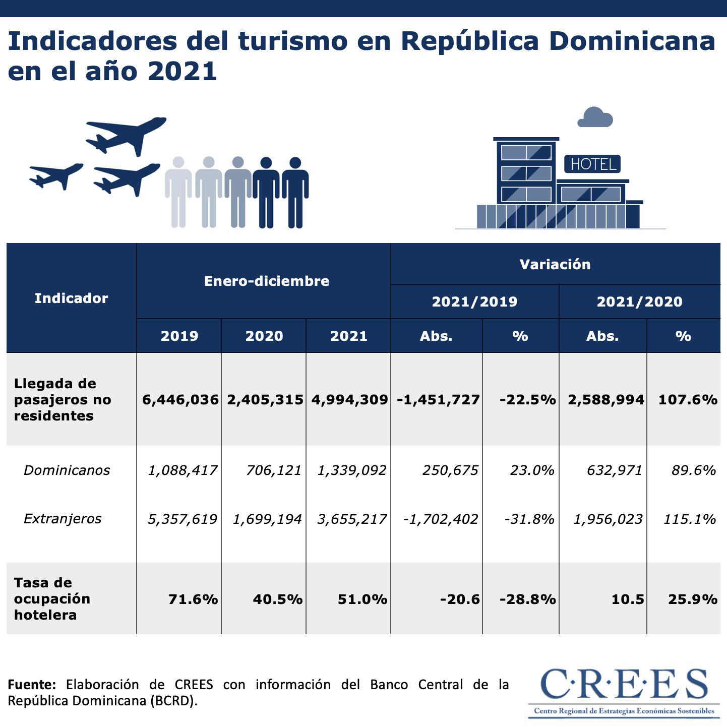De acuerdo con los datos del Banco Central de la República Dominicana (BCRD), en el año 2021 la llegada acumulada de pasajeros no residentes, es decir, tanto extranjeros como dominicanos que ingresaron al país por los diferentes aeropuertos internacionales fue de 4,994,309. Esta cifra significa una diferencia de 2,588,994 visitantes más con respecto al mismo periodo del 2020 y una diferencia de 1,451,727 menos con respecto al mismo periodo del 2019.