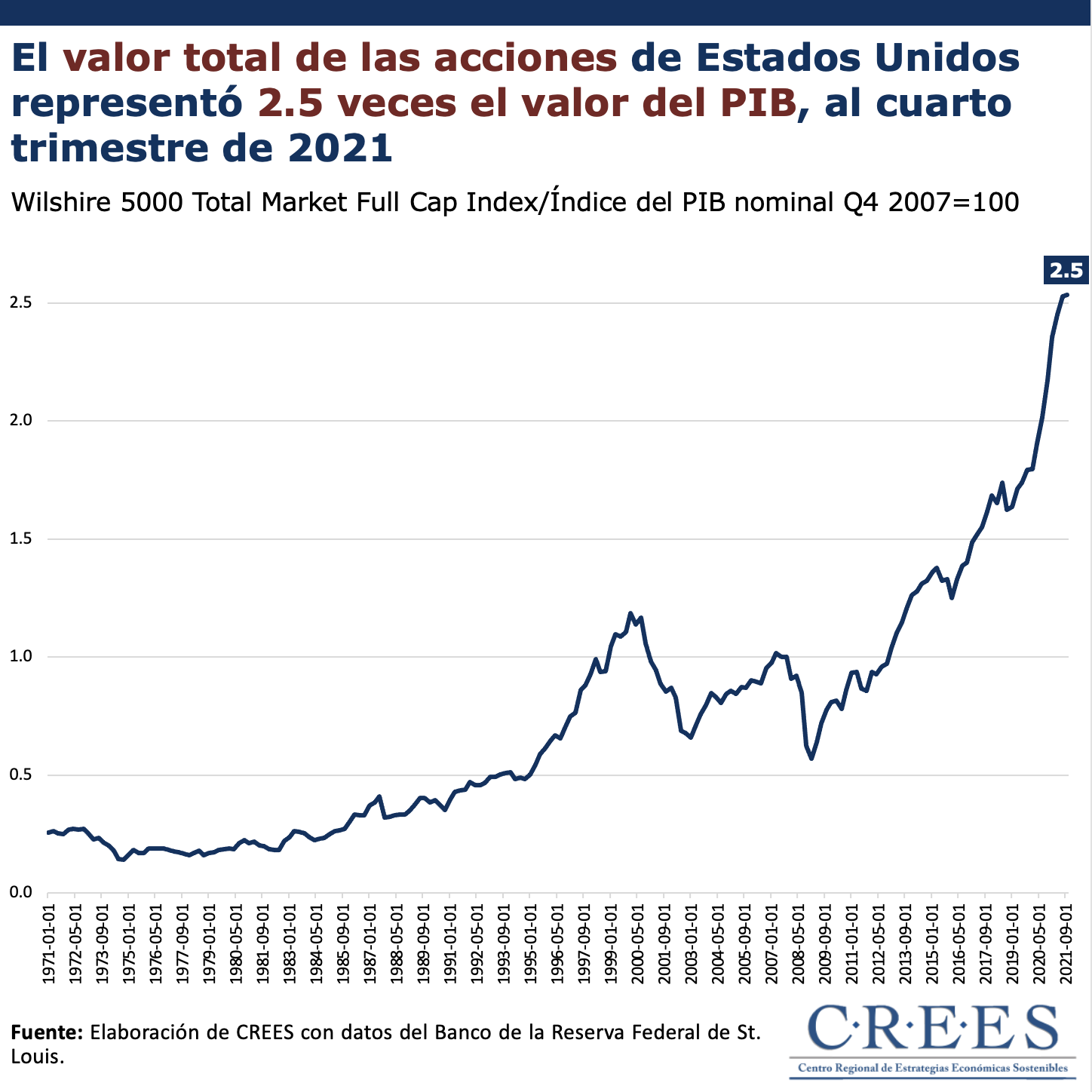 El Índice de Capitalización Total del Mercado Completo Wilshire 5000 es una medida del valor de todas las acciones que se tranzan en Estados Unidos. En 2007 ese índice tenía el mismo valor que el Producto Interno Bruto (PIB) –que el valor total de mercado de los bienes y servicios producidos dentro de ese país. Sin embargo, en 2021 llegó a representar 2.5 veces el valor del PIB. ¿Por qué?