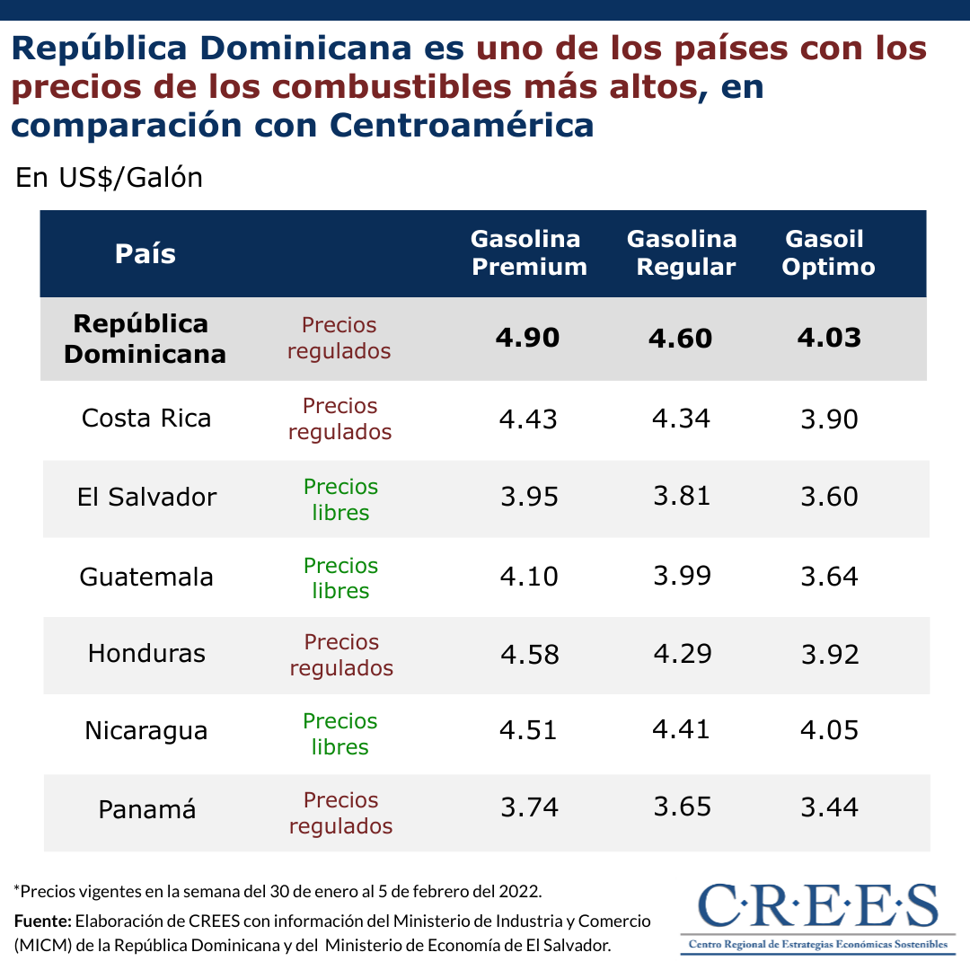 De acuerdo con la información de precios oficiales correspondientes a la semana del 30 de enero al 5 de febrero del 2022, en comparación con economías similares, los países de Centroamérica, la República Dominicana se mantiene siendo uno de los países con los precios de los combustibles más altos.