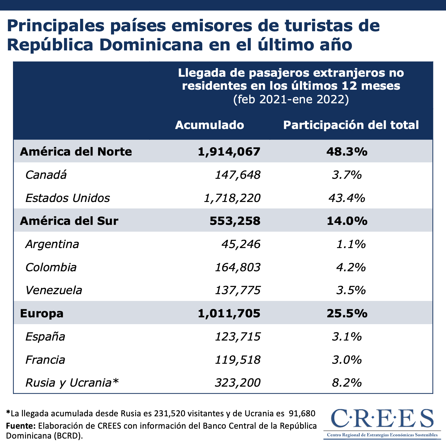 De acuerdo con los datos del Banco Central de la República Dominicana (BCRD), en los últimos 12 meses (desde febrero de 2021 a enero del 2022) el 87.8% de los pasajeros extranjeros no residentes provenían de América del Norte, América del Sur y Europa.