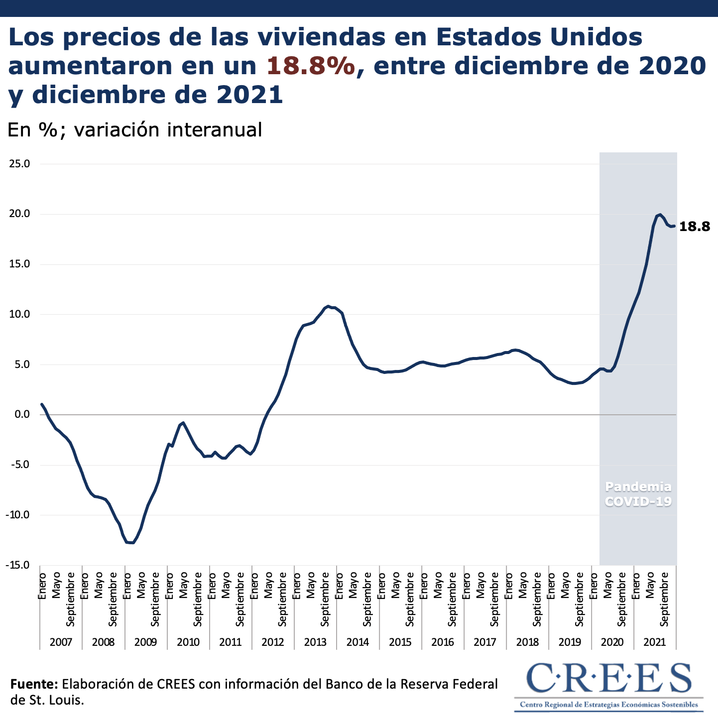 Desde finales de 2020, las bajas tasas de interés de préstamos hipotecarios –por la política monetaria expansiva de la Reserva Federal–, y el incentivo de movilidad de las personas de hogares urbanos a hogares suburbanos que ha creado la pandemia de COVID-19, incrementaron la demanda de viviendas en Estados Unidos y, en consecuencia, impulsaron el nivel de precios. En adición a esto, el incremento en los precios de los materiales necesarios para construir o remozar una vivienda, como la madera, el acero y el cobre, también ha incidido en el aumento de los precios en el mercado inmobiliario de Estados Unidos.