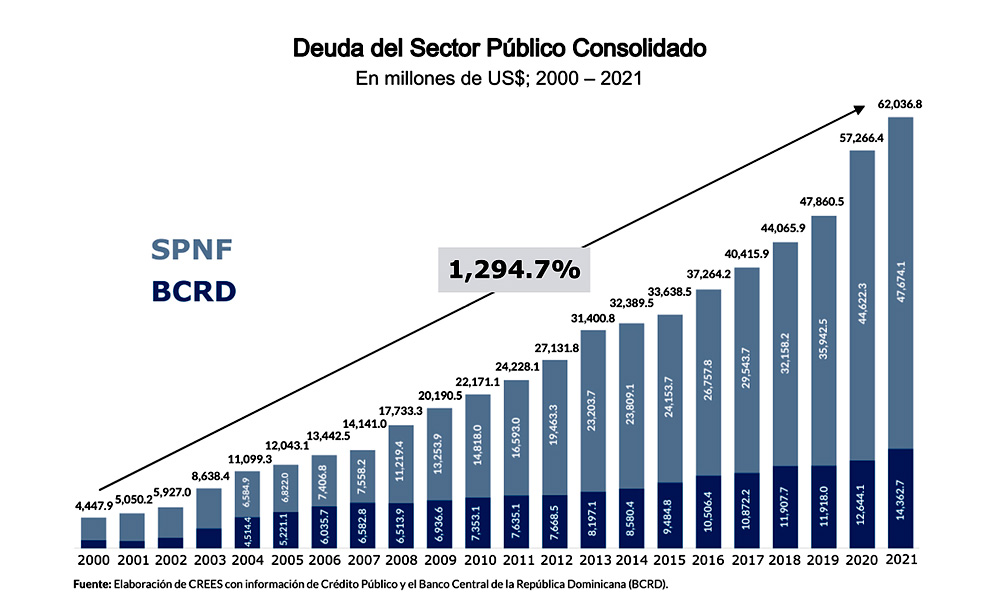 Al sumar la deuda del Banco Central de la República Dominicana, el total representó US$62,036.8 millones. Eso es US$4,770.4 millones más que al 31 de diciembre de 2020. Esto, de acuerdo con un estudio del Centro Regional de Estrategias Económicas Sostenibles (CREES).