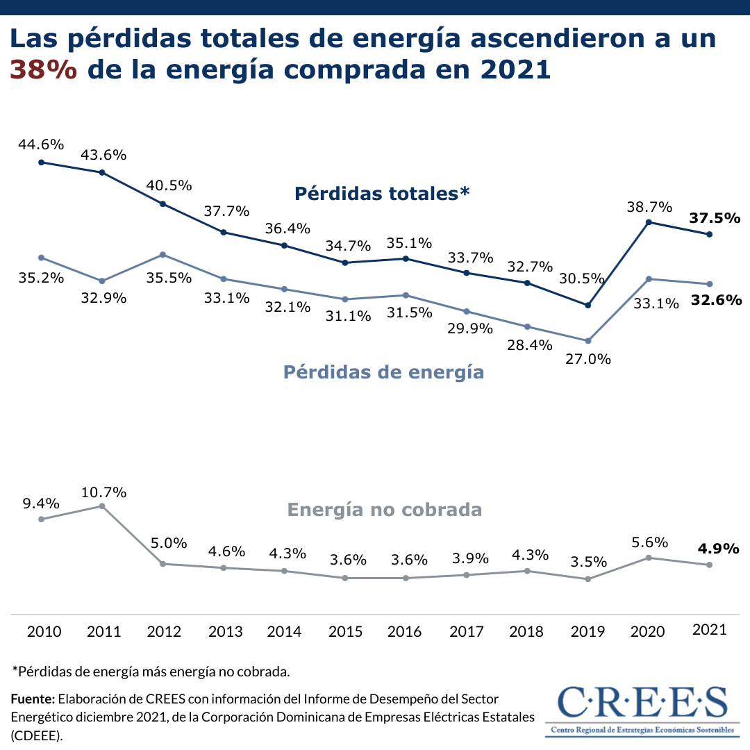 En el año 2021 las pérdidas de energía de empresas distribuidoras de electricidad (EDE) ascendieron a 5,416.2 GWh. Esto, con relación a la compra de energía de este año de 16,602.3 GWh, representan unas pérdidas de 33.6%. Si a estas pérdidas se le suma el promedio de energía no cobrada en 2021, que fue de 4.9%, se estima que las pérdidas totales de energía eléctrica ascendieron a un 37.5% de la energía comprada en 2021; una reducción de 1.2 puntos porcentuales con respecto al porcentaje de 2020 y un aumento 7.0 puntos porcentuales con respecto al de 2019.