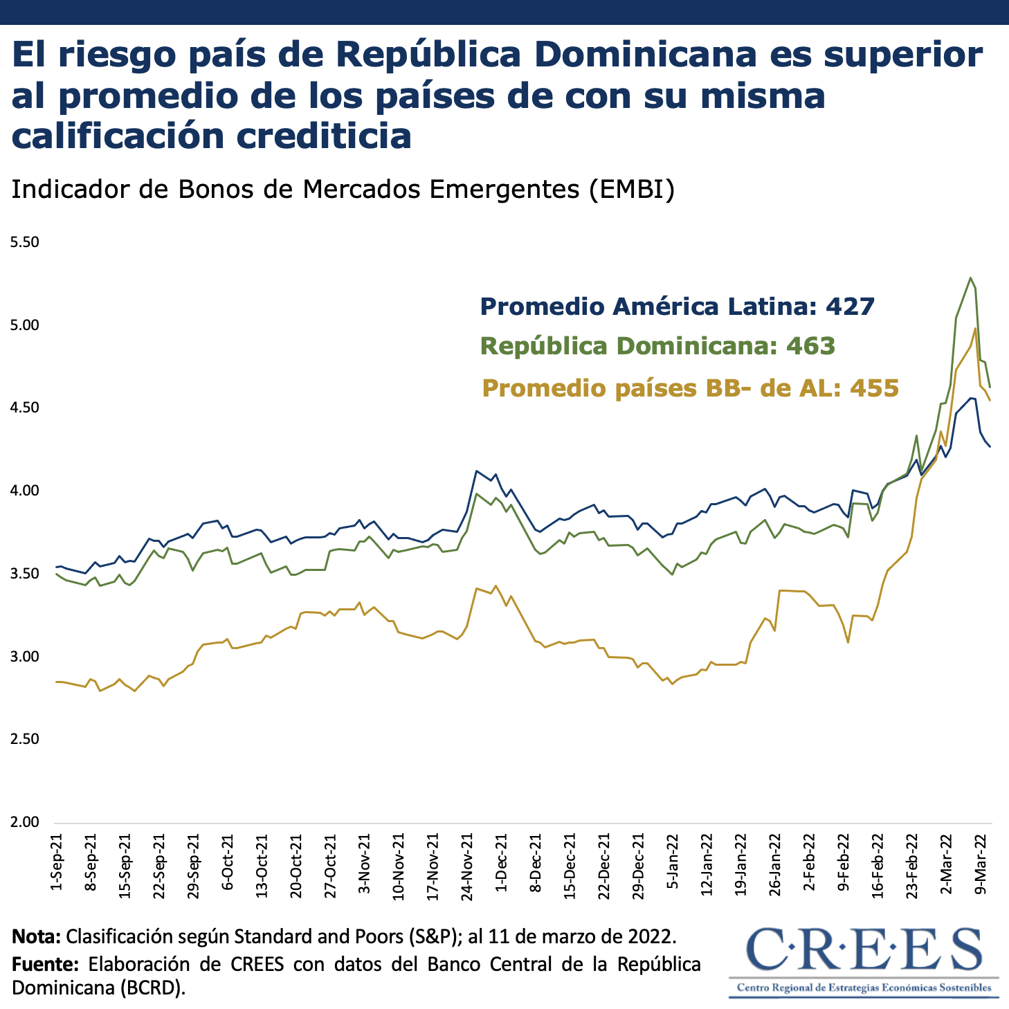 Como se puede observar en la gráfica, República Dominicana mantiene un riesgo mayor que los países de igual calificación otorgada por las calificadoras de riesgo (BB-). Es decir, la deuda de República Dominicana es más costosa que la de Brasil, Guatemala y Honduras; países con igual calificación. Actualmente, para un inversor comprar un título dominicano demanda un rendimiento de 463 puntos básicos sobre un título del tesoro del Estados Unidos, mientras que, en promedio, demanda 455 puntos básicos más para adquirir un títulos de los demás países con calificación BB-. De igual forma, la prima de riesgo que se exige a los bonos de República Dominicana supera la que deben pagar, en promedio, lo países de América Latina.