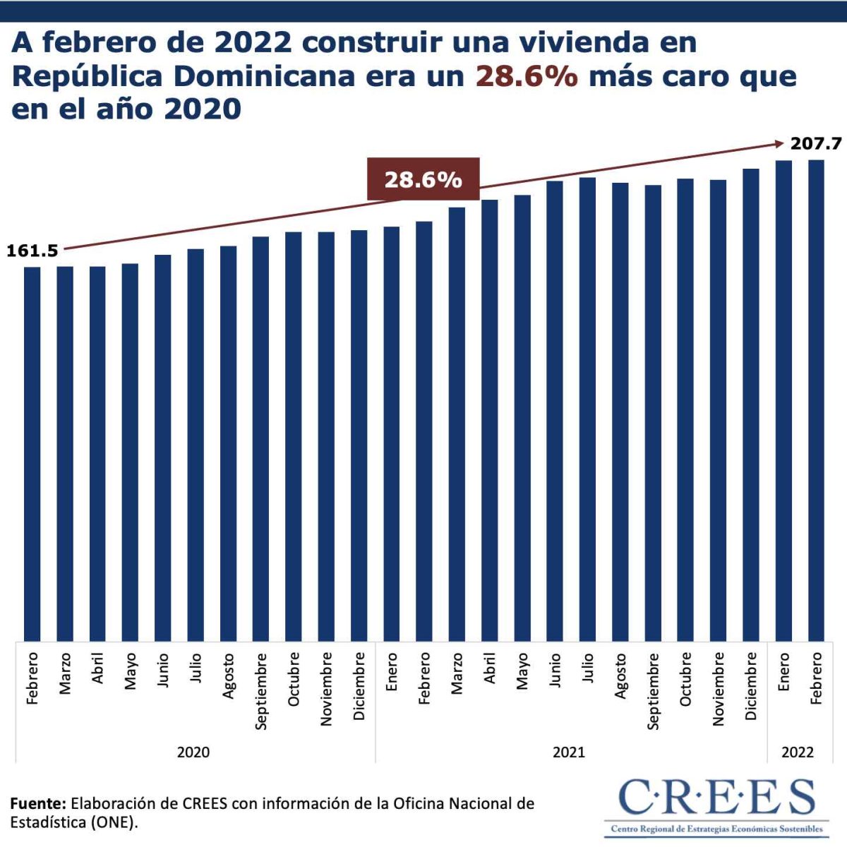 En febrero de 2022, el Índice de Costos Directos de la Construcción de Viviendas (ICDV) fue de 207.7, en promedio, reflejando una incremento interanual de 14.7%. De igual forma, con respecto al mismo mes del año 2020 presentó un incremento de 28.6%. En otras palabras, actualmente construir una vivienda en República Dominicana es 28.6% más caro que en el año 2020, en promedio.