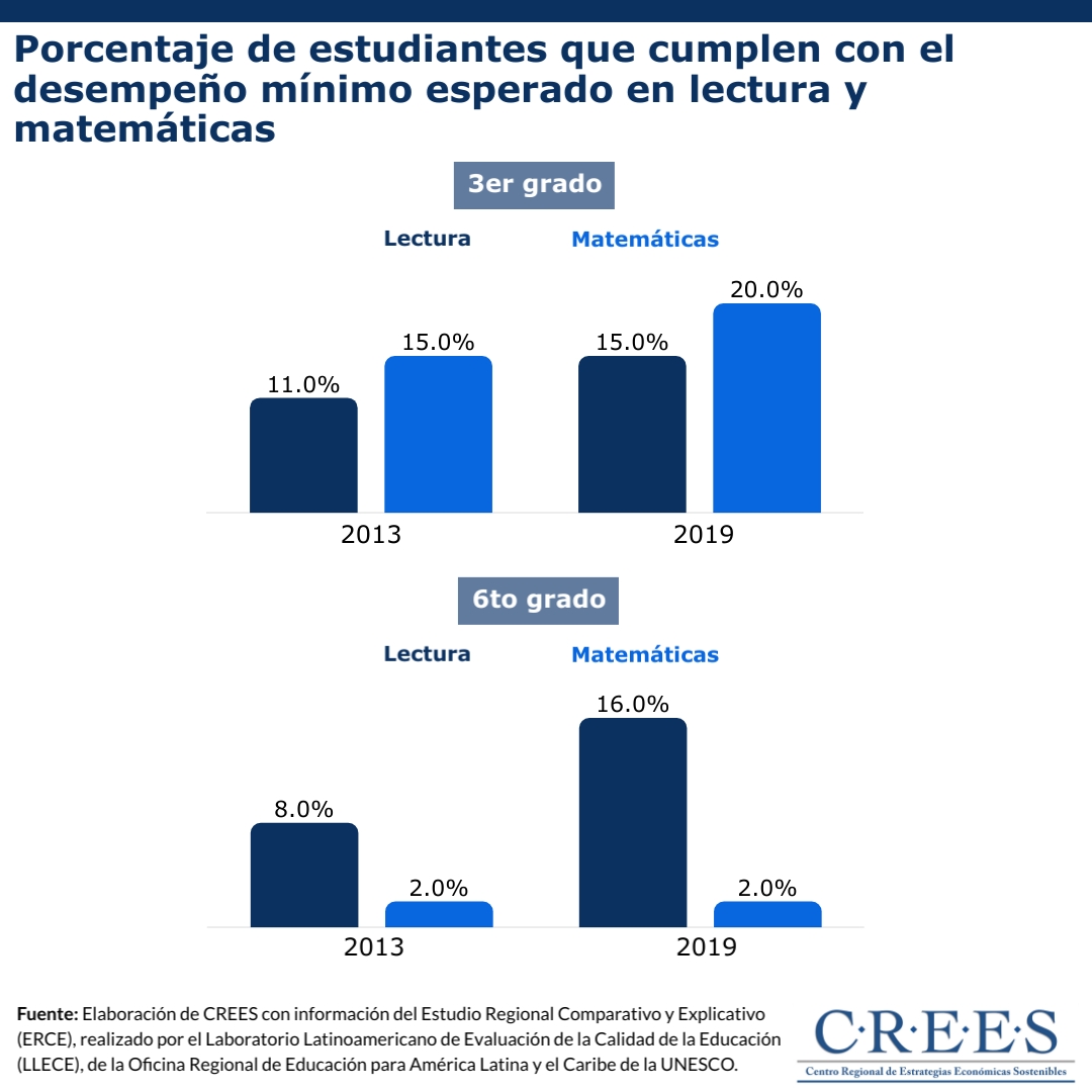 Los resultados en lectura de los estudios TERCE y ERCE para estudiantes de 3er grado muestran una ligera mejoría entre los años 2013 y 2019. Sin embargo, en el último estudio, solo el 15% de los estudiantes dominicanos evaluados cumplía con el desempeño mínimo esperado en lectura. Este resultado ubicaba a República Dominicana como el país con peor resultado en lectura de la región. En cuanto a matemáticas, solo 20 de cada 100 estudiantes de 3er grado cumplía con el desempeño mínimo esperado.