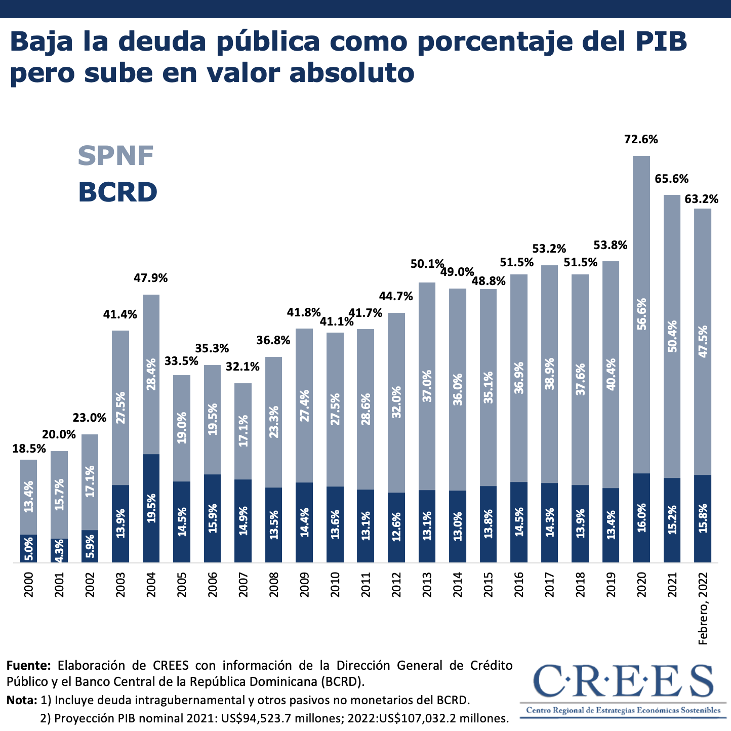 De acuerdo con los datos de la Dirección General de Crédito Público y el Banco Central de la República Dominicana (BCRD), en febrero de 2022 la deuda pública consolidada de República Dominicana (incluyendo deuda intergubernamental) se ubicó en 63.2% del PIB. Esto significa una reducción de 2.4 puntos porcentuales en comparación la ejecución en el año 2021. Sin embargo, en términos absolutos, a febrero de 2022, la deuda pública consolidada ascendió a US$67,682.0 millones. Es decir que, en comparación con el nivel de endeudamiento al cierre de 2021 de US$62,036.8 millones, la deuda pública consolidada creció en US$5,645.2. Un incremento neto de 8.3%.