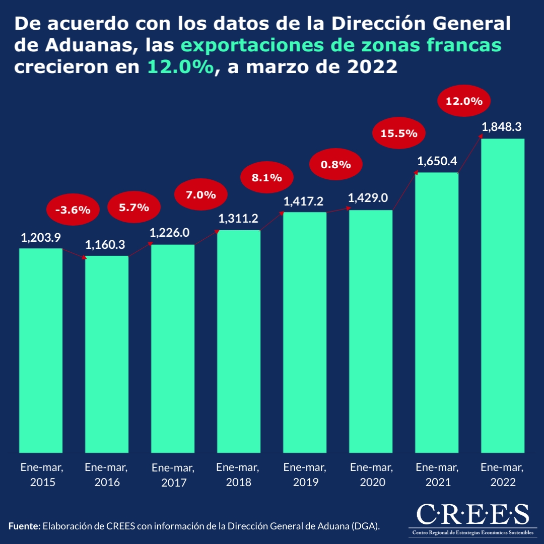 De acuerdo con los datos de la Dirección General de Aduanas (DGA), las exportaciones de las empresas de zonas francas en la República Dominicana crecieron en un 12.0% en el primer trimestre de 2022; registrando US$198.0 millones más en comparación con lo registrado en el mismo periodo del año 2021. De igual forma, con respecto al periodo enero-marzo de 2020, crecieron en un 29.3%; registrando unos US$419.3 millones más.