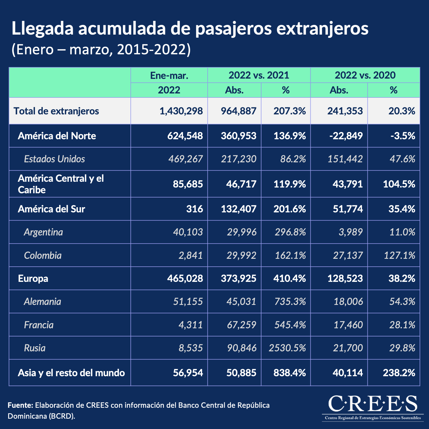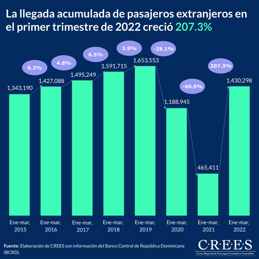 En el primer trimestre de 2022 la llegada acumulada de pasajeros extranjeros no residentes fue de 1,430,298, que en comparación con los 465,411 de 2021 equivalen a unos 964,887 visitantes más. Es decir, una crecimiento interanual de 207.3% con respecto al mismo periodo del año 2021. En comparación con el 2020, la llegada acumulada en el periodo enero-marzo representa un aumento de 20.3%, equivalente a 241,353 visitantes más.