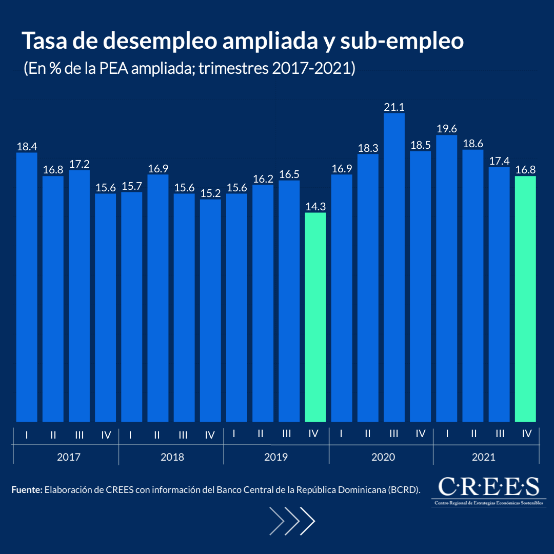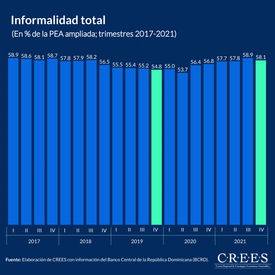 De acuerdo con los datos de la Encuesta Nacional Continua de Fuerza de Trabajo (ENCFT) del Banco Central de la República Dominicana, desde el inicio de la pandemia en el primer trimestre de 2020 al último trimestre de 2021 la cantidad de ocupados –tanto en el sector formal como informal– se ha incrementado en 76,205 trabajadores. Sin embargo, el año 2021 cerró con unos 34,110 trabajadores menos de los prevalecían previo a la pandemia, al último trimestre de 2019.