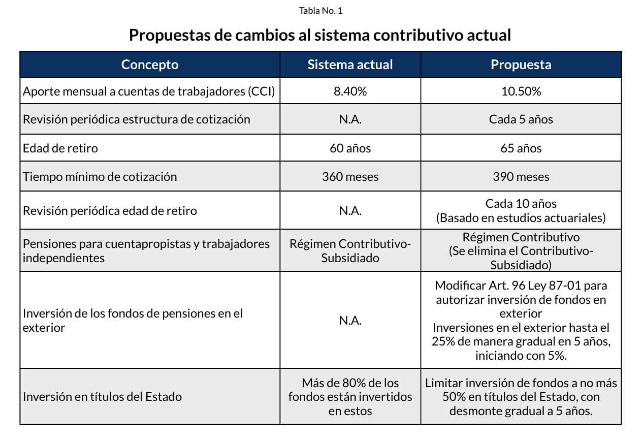 La primera modificación consiste en incrementar el aporte mensual destinado a las cuentas de capitalización individual (CCI) de los trabajadores del 8.40% actual a 10.50%. El monto de la cotización no se revisa desde la modificación a la ley 87-01 realizada por medio de la ley No. 188-07. En tal sentido es necesario realizar modificaciones cada cinco años. Igualmente, se propone revisar la edad de retiro para que sea 65 años. Este incremento guarda relación con el aumento en la esperanza de vida desde que fue diseñada la ley hace veinte años y con las expectativas actuales.