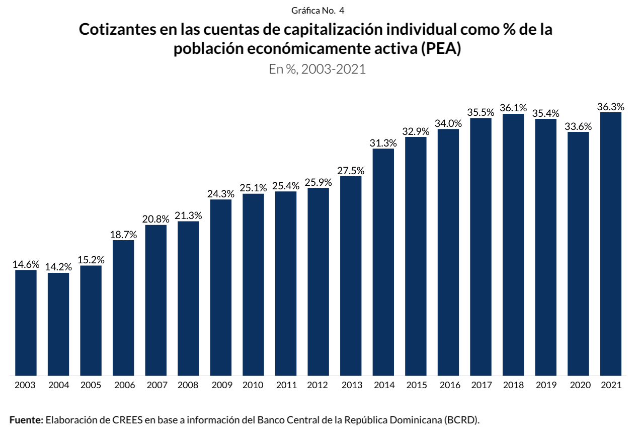 Como consecuencia de los problemas del mercado laboral, la proporción de cotizantes como porcentaje de la fuerza de trabajo (PEA) en República Dominicana es baja; la mitad que en los países de la Organización para la Cooperación y el Desarrollo Económicos (OCDE). Es importante tener en cuenta que los países OCDE, en su casi totalidad, tienen sistemas de reparto que operan con altos niveles de deudas implícitas de pensiones. Para que un sistema de reparto sea viable no basta tener una tasa de cotizantes sobre la PEA de 72%; aún con estos altos niveles los sistemas previsionales de la OCDE son insostenibles financieramente.