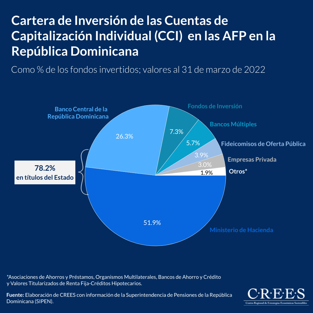 De la manera en que funciona el sistema de CCI es que las AFP invierten los ahorros de los trabajadores y estas inversiones generan una rentabilidad que se va acumulando en la cuenta de cada trabajador en adición a los aportes (propios y del empleador). Desde el CREES se ha señalado en varias ocasiones como los fondos del sistema de pensiones no están siendo empleados para financiar proyectos productivos. Al 31 de marzo del 2022, un 51.9% de los ahorros de los trabajadores está invertido en títulos del Ministerio de Hacienda y un 26.3% del Banco Central de la República Dominicana (BCRD). Es decir, el 78.2% de los fondos de pensiones se han convertido en recursos para financiar los déficits fiscales y cuasi-fiscales.