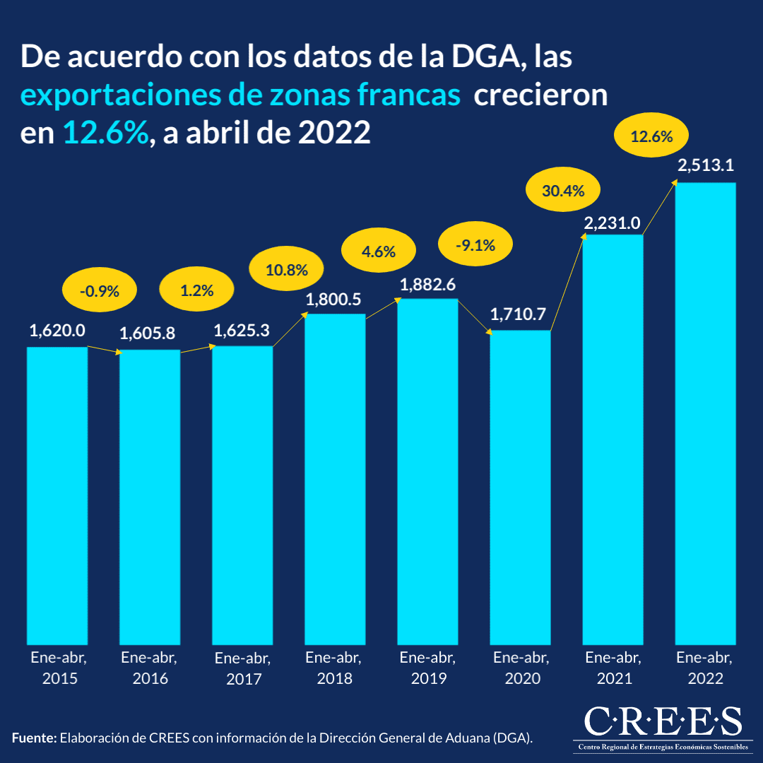 De acuerdo con los datos de la Dirección General de Aduanas (DGA), las exportaciones de las empresas de zonas francas en la República Dominicana crecieron en un 12.6% en el periodo enero-abril 2022; registrando US$282.0 millones más en comparación con lo registrado en el mismo periodo del año 2021. De igual forma, con respecto al periodo enero-abril de 2020, crecieron en un 46.9%; registrando unos US$802.4 millones más. Es importante tener en cuenta que este crecimiento en términos reales es menor debido a la inflación mundial; en particular, en abril de 2022 la inflación de Estados Unidos fue de 8.2%.