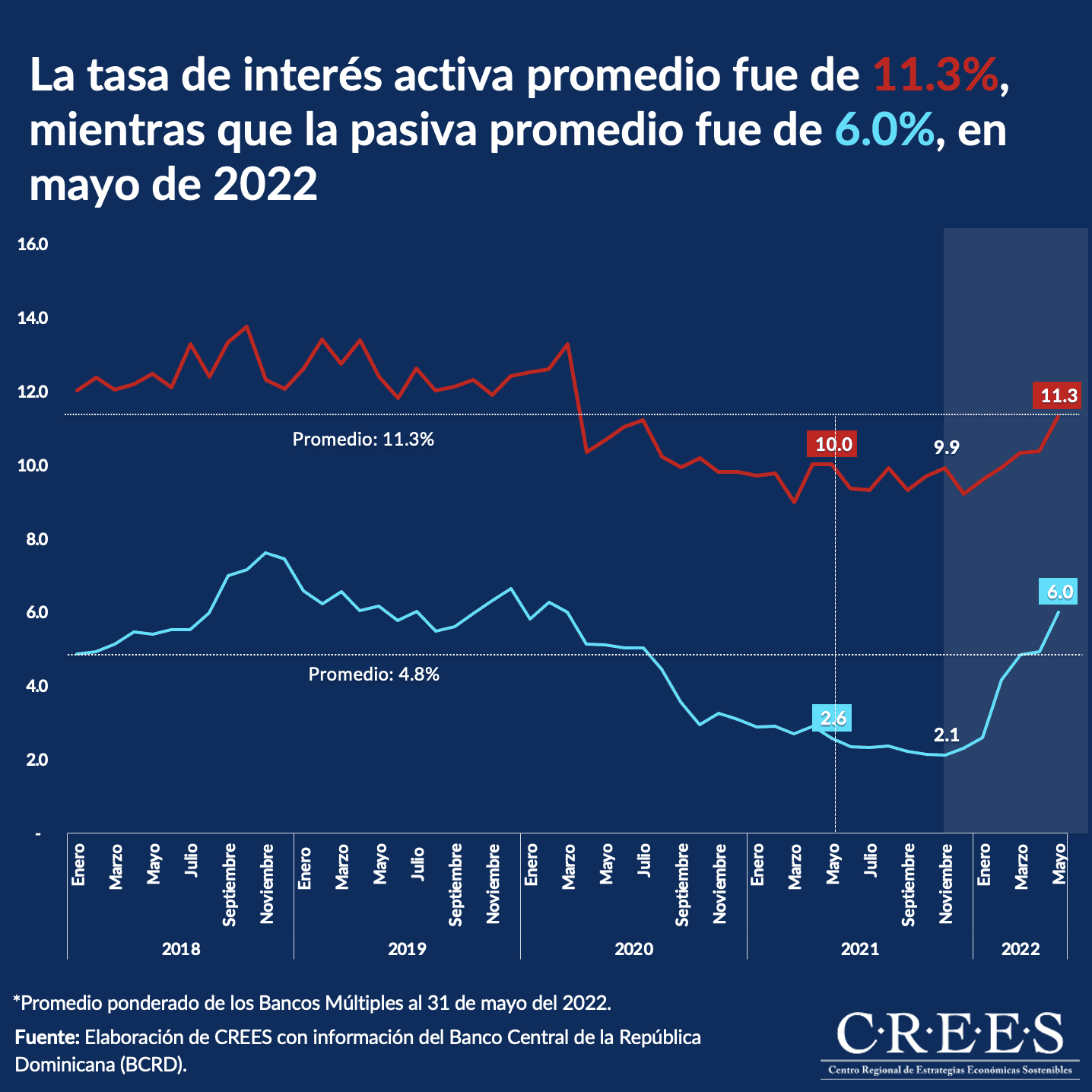 En mayo de 2022, la tasa de interés activa promedio ponderada de los Bancos Múltiples fue de 11.3%, mientras que la tasa de interés pasiva promedio ponderada de los Bancos Múltiples fue de 6.0%, lo que equivale a un margen de intermediación de 5.3 puntos porcentuales.