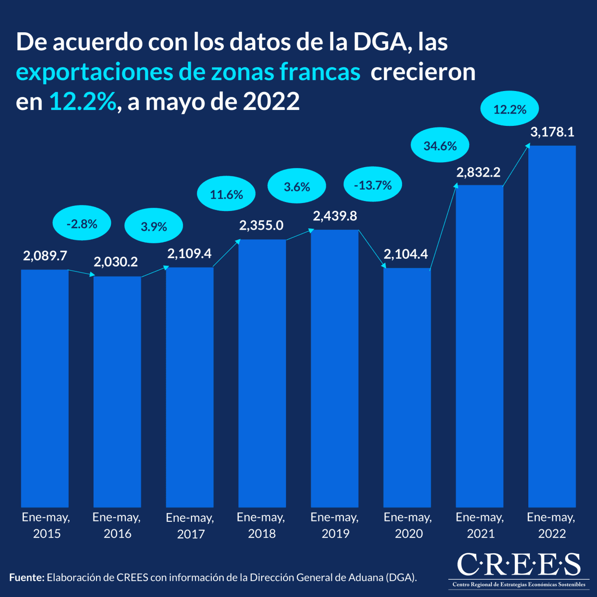 De acuerdo con los datos de la Dirección General de Aduanas (DGA), las exportaciones de las empresas de zonas francas en la República Dominicana crecieron en un 12.2% en el periodo enero-mayo 2022; registrando US$345.9 millones más en comparación con lo registrado en el mismo periodo del año 2021. De igual forma, con respecto al periodo enero-mayo de 2020, crecieron en un 51.0%; registrando unos US$1,073.7 millones más. Es importante tener en cuenta que este crecimiento en términos reales es menor debido a la inflación mundial; en particular, en mayo de 2022 la inflación de Estados Unidos fue de 8.6%.