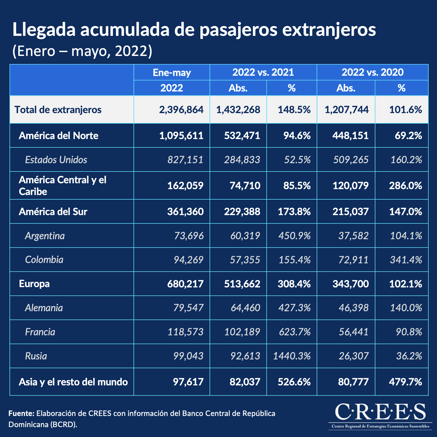 Al mes de mayo de 2022 se registró un total de 2,902,280 visitantes no residentes, es decir, tanto extranjeros como dominicano que ingresaron al país por los diferentes aeropuertos internacionales. Esta cifra significa una diferencia de 1,467,173 visitantes más con respecto al mismo periodo del 2021 y una diferencia de 1,509,210 más con respecto al 2020.