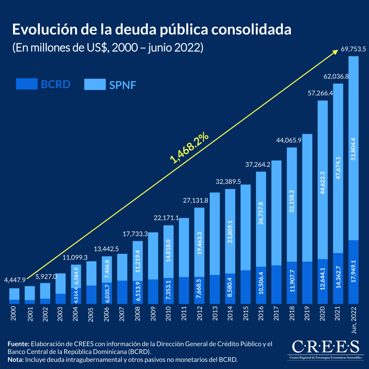 De acuerdo con los datos de la Dirección General de Crédito Público y el Banco Central de la República Dominicana (BCRD), en junio de 2022 la deuda pública consolidada de República Dominicana (incluyendo deuda intergubernamental) ascendió a US$69,753.5 millones, de los cuales, US$51,804.4 millones correspondían a la deuda del sector público no financiero (SPNF) y los restantes US$17,949.1 millones provenían de los pasivos del BCRD. Como porcentaje del PIB, la deuda del SPNF representó un 47.5% y la del BCRD representó un 16.5%; ubicando así la deuda pública consolidada en 64.0% del PIB en junio de 2022.