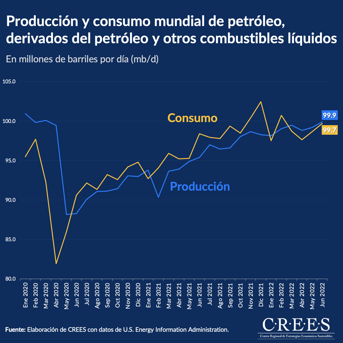 Según los datos de la Administración de Información Energética de Estados Unidos (EIA, por sus siglas en inglés), en junio de 2022 el consumo mundial de petróleo, derivados del petróleo y otros combustibles líquidos promedió 99.7 millones de barriles por día (mb/d). Esto significa un incremento de 1.3% con respecto al consumo promedio de junio 2021, equivalente a 1.3 mb/d más. Con relación a junio de 2020, el consumo promedio se incrementó en un 10.0%, equivalente a 9.1 mb/d más.