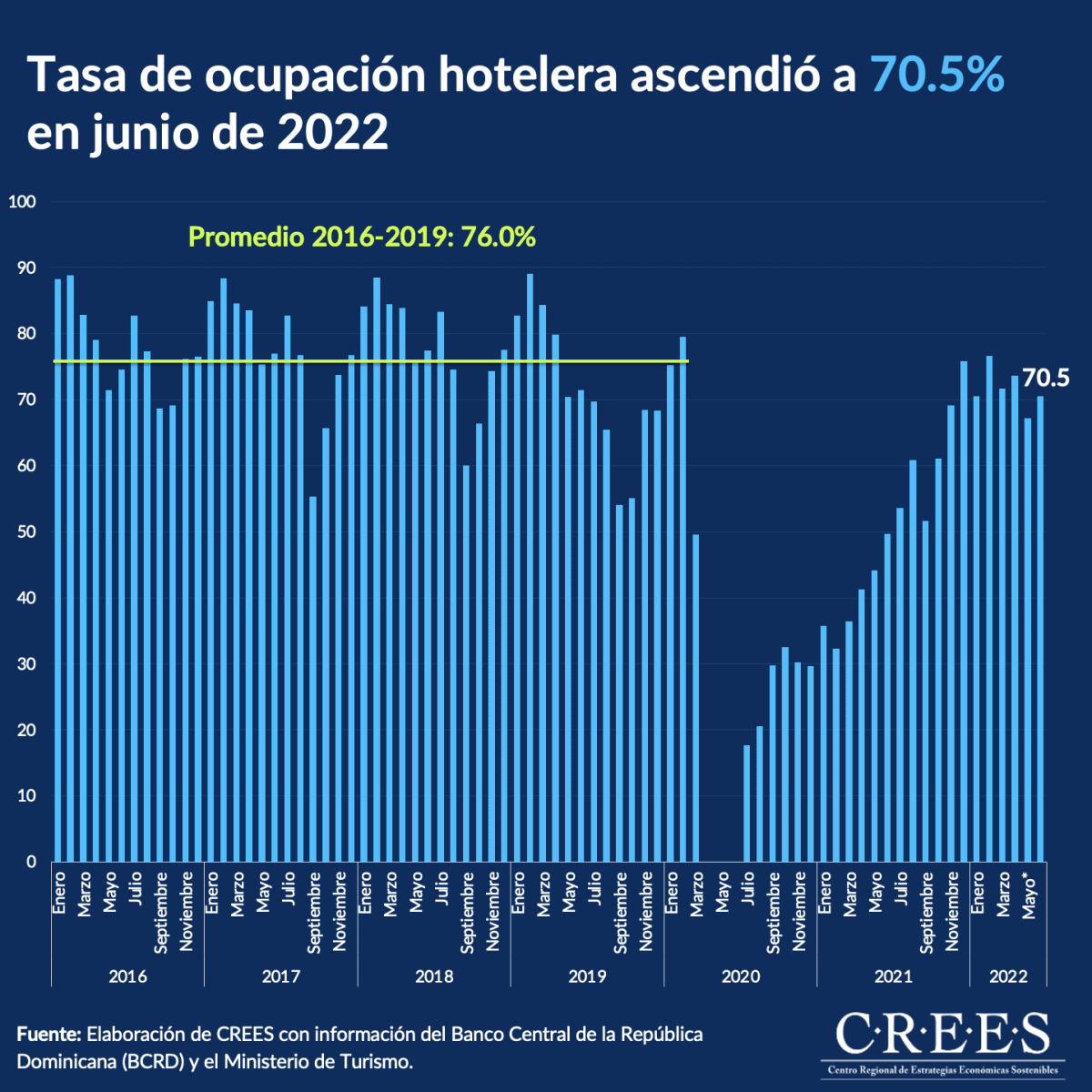 Es preciso aclarar que la gráfica muestra la serie de la tasa promedio de ocupación en establecimientos de alojamiento turístico del Banco Central de la República Dominicana hasta marzo de 2022. Para el periodo abril-junio 2022 muestra los datos de la tasa de ocupación hotelera abierta del Ministerio de Turismo; que representa el total de habitaciones de alojamiento turístico ocupadas sobre el total de habitaciones en operación.