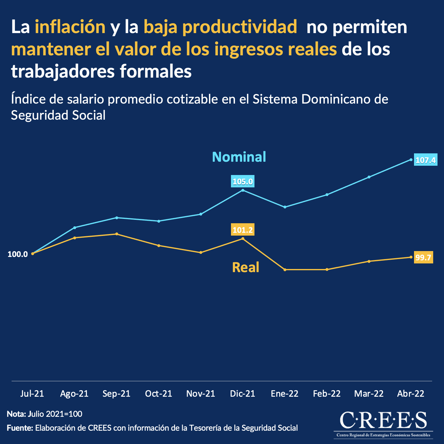 De acuerdo con los últimos datos disponibles sobre el salario promedio cotizable en el Sistema Dominicano de Seguridad Social (SDSS), a abril de 2022, el salario real promedio cotizable en el SDSS había disminuido 1.4% en comparación con el de diciembre de 2021.