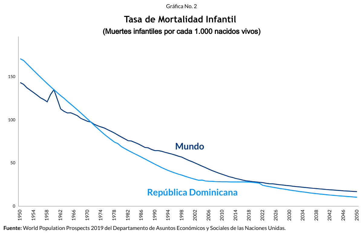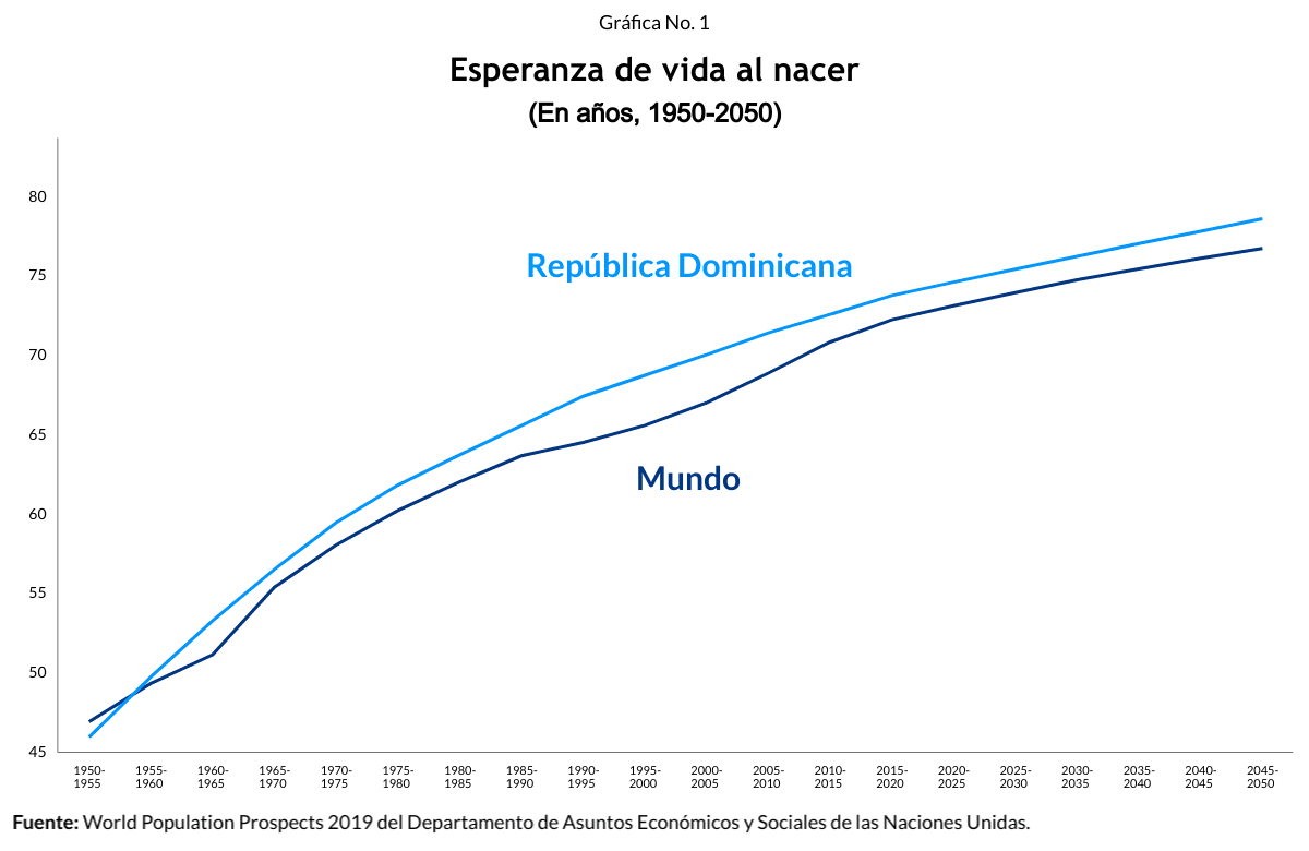 De acuerdo con las estimaciones de las Naciones Unidas, actualmente las personas viven vidas más largas. En los últimos 70 años la esperanza de vida al nacer promedio del mundo pasó de 47 a 73 años. Los dominicanos pasamos de 50 a 75 años. La tasa de mortalidad infantil en el mundo paso de 143 a 26 muertes por cada 1,000 niños nacidos vivos. Y en República Dominicana pasamos de 171 a 24 muertes por cada 1,000 niños nacidos vivos.