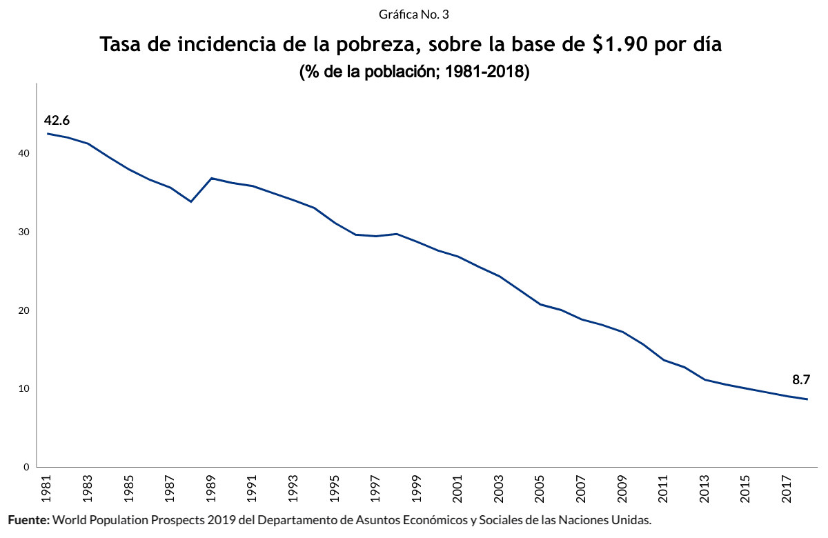 Según los datos del Banco Mundial, en 1981 el 42.1% de la población mundial vivía en la pobreza extrema. Desde entonces, la proporción de la población extremadamente pobre ha disminuido a 8.7% en 2018 (el último dato disponible).