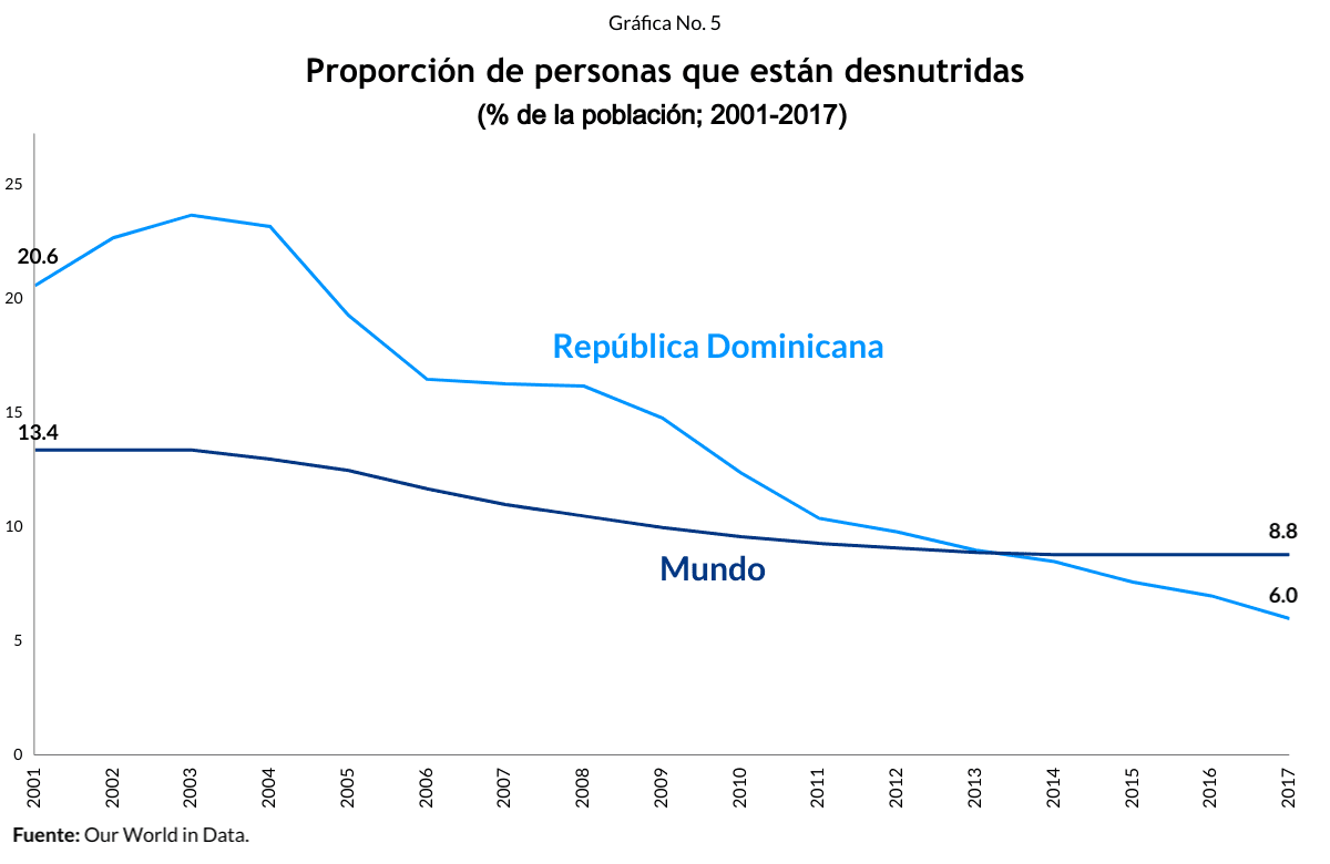 También, ha mejorado la alimentación de las personas. Los datos muestran cómo en solo dieciséis años la proporción de la población que tiene una ingesta calórica que es insuficiente para cumplir con los requisitos mínimos de energía necesarios para un individuo en el mundo ha pasado de 13.4% a 8.8%. En particular, la proporción de personas que están desnutridas en República Dominicana en este mismo periodo de 20.6% a 6.0%.