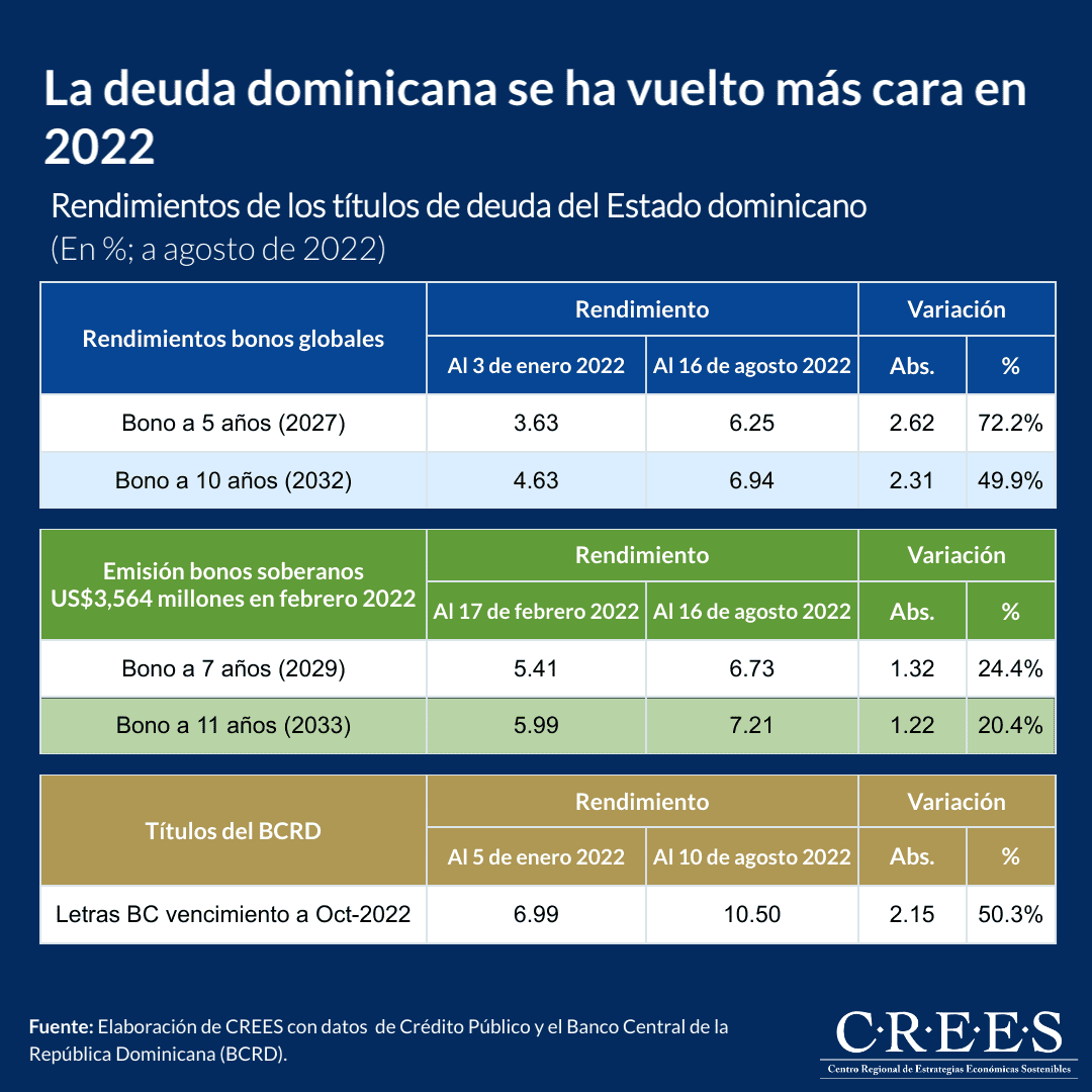 En efecto, la deuda dominicana se ha vuelto más cara. Dependiendo del plazo, los rendimientos demandados para bonos y letras han aumentado hasta un 72%. Los bonos soberanos emitidos a mediados de febrero pasado ya estaban reflejando el incremento demandado por los mercados ante mayor riesgo. A pesar de ese mayor cupón para emitirlos, las variaciones del mercado de deuda desde entonces señalan que esas emisiones son 20% o 24% más caras ahora.